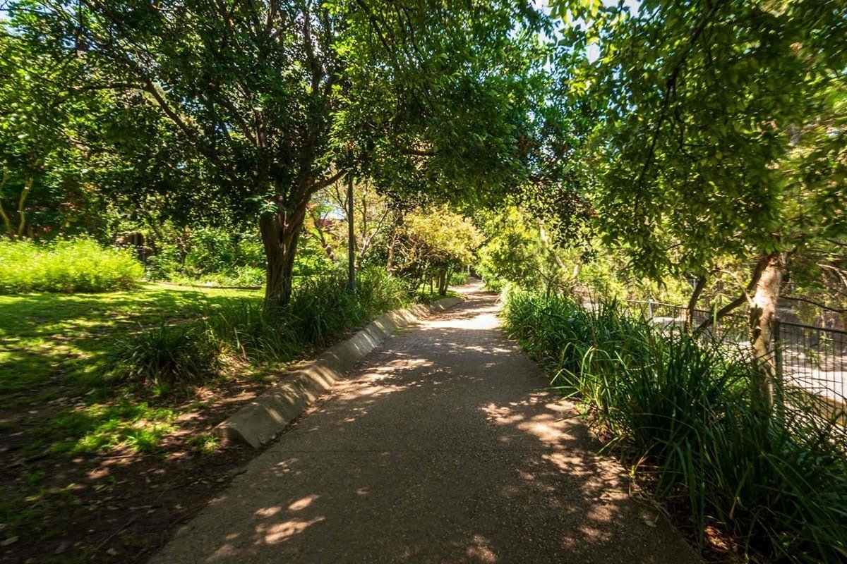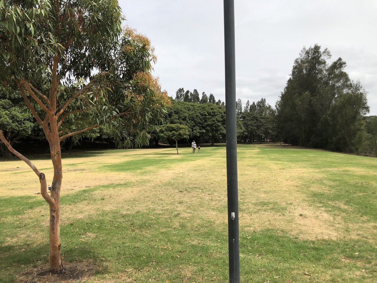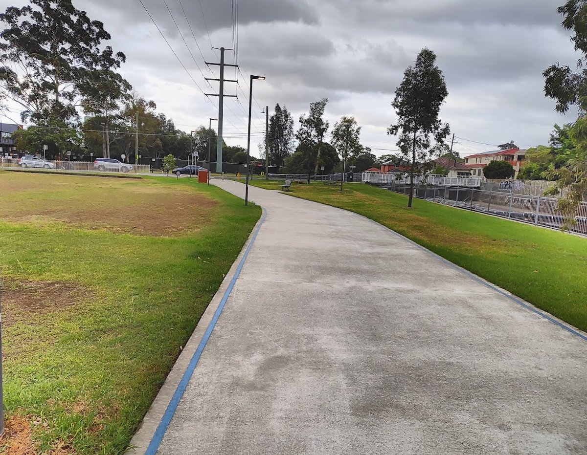 Canal Reserve is a sprawling green space in Australia that serves as a popular destination for dog owners and outdoor enthusiasts. The park is defined by its expansive, well-maintained grassy fields which provide ample room for dogs to run and play. A notable feature of the reserve is the impressive historic concrete aqueduct that arches over the landscape, accompanied by large, mature trees like Moreton Bay Figs and palms that offer significant natural shade. For convenience, the park includes a paved walking track with a blue line marking, which is ideal for walking dogs or jogging. Visible amenities include park benches and trash receptacles, though specific dog-related facilities like bag dispensers or water stations are not immediately apparent in the provided views. Safety fencing is present along the adjacent canal, though the main park area appears to be an open-plan reserve rather than a fully enclosed dog run. The overall atmosphere is serene and open, with street lighting poles suggesting the area is accessible during early morning or evening hours.
