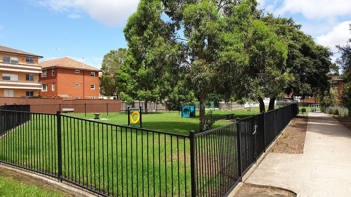 Ashbury Dog Park in Australia offers a diverse range of spaces for dogs and their owners to enjoy. The park features a very large, open grassy area with a notable slope, providing plenty of room for high-energy dogs to run and play. In addition to the expansive fields, there is a dedicated, smaller fenced-in section specifically equipped with dog agility features such as a tunnel and a jumping hoop. The park is well-maintained and equipped with essential facilities, including multiple water stations, trash cans with integrated waste bag dispensers, and several benches for owners to rest. Numerous mature trees are scattered throughout the grounds, providing ample natural shade for both pets and people. The overall atmosphere is open and scenic, with some elevated areas offering pleasant views of the surrounding residential neighborhood. Fencing types vary between traditional chain-link and modern black metal styles. Lighting is also present, suggesting the park is accessible during early morning or evening hours. A unique multi-level observation tower is a prominent landmark within the broader park area.