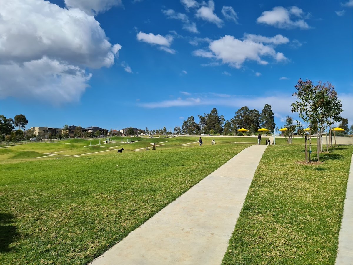 Bardia Dog Park is a spacious and well-maintained recreational area featuring expansive green lawns and modern facilities. The park offers a large, open space for dogs to run off-leash, characterized by rolling grassy hills and paved walking paths that meander through the grounds. For canine enrichment, the park includes agility equipment such as a climbing bridge. The area is equipped with essential amenities including trash cans with integrated waste bag dispensers to encourage cleanliness. For human visitors, there are several benches, picnic tables under shelters, and a vibrant, fenced-in children's playground with multiple slides and climbing structures. While much of the park is open, chain-link fencing is used to secure specific areas like the playground. Shade is provided by a mix of mature trees and large yellow permanent umbrellas. The overall atmosphere is family-friendly and active, set against a backdrop of residential development and natural bushland. The terrain is varied, featuring both flat sections and significant slopes, making it an engaging environment for both pets and their owners.