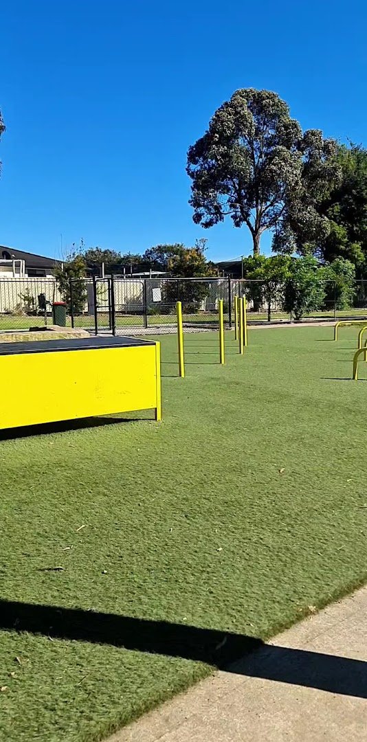 Baden Powell Reserve Offleash Dog Facility is a modern and well-maintained fenced dog park located in a suburban setting. The park features a large, open space with a mix of natural grass and specialized artificial turf sections specifically for agility training. Visible agility equipment includes an A-frame ramp, various hurdles, and jumping platforms, providing ample stimulation for active dogs. For human visitors, the park is equipped with sheltered picnic tables, multiple benches, and even scattered plastic chairs for comfort. Essential amenities are well-provided, including a water fountain, trash cans, and waste bag dispensers located along a paved internal walking path. The facility is secured by a sturdy chain-link fence and includes some sloped areas, adding variety to the terrain. While mature trees line the perimeter and offer some natural shade, the primary shaded areas are the man-made shelters. Street lighting is installed throughout the park, enhancing visibility. The overall atmosphere is one of a clean, dedicated community space designed for safe, off-leash exercise and socialization.