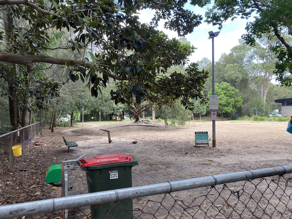 Erko Pocket Park is a multi-faceted community space in Australia that caters to both pet owners and families. The park features a dedicated fenced dog area, as seen in the provided images, which is equipped with essential amenities including a water fountain with a dog bowl, a waste bin, and a dog bag dispenser. This area is primarily surfaced with a mix of dirt and sparse grass, providing a functional space for exercise under the shade of large, mature trees. The park also includes expansive open grassy areas like Harry Noble Reserve, suitable for various outdoor activities. For families, there are playground facilities featuring swings and climbing structures. Seating is well-provided with several benches located throughout the grounds. While some sections, such as the George Street Reserve, are designated as on-leash areas, the fenced enclosure offers a secure environment for dogs. The atmosphere is a blend of urban utility and natural greenery, enhanced by local murals and clear directional signage. Overhead lighting is also present, extending the park's usability.