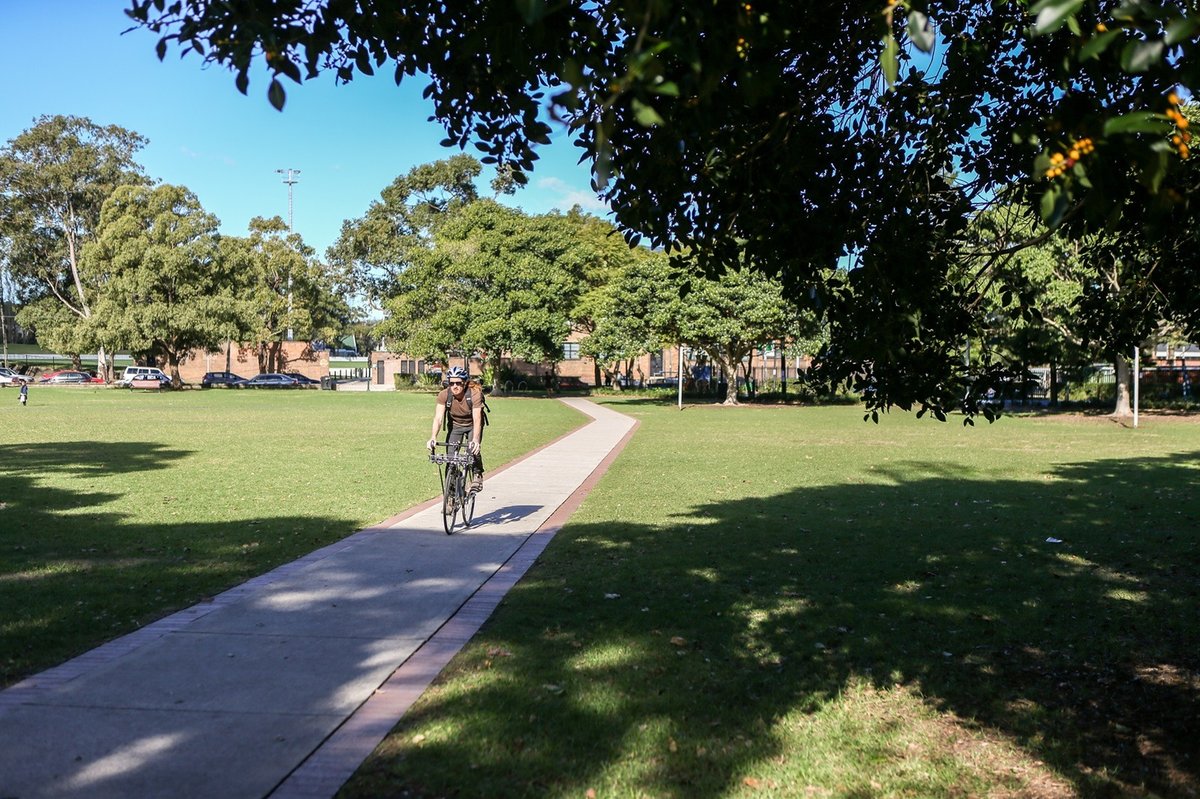 Harry Noble Reserve is a spacious urban park located in Erskineville, Australia. It features large, open grassy areas suitable for various activities, including dog walking. The park is well-shaded by numerous mature trees, providing a pleasant environment even on sunny days. Facilities include several park benches on concrete pads, paved walking and cycling paths that crisscross the green space, and bike racks. The reserve is adjacent to Erskineville Oval, a fenced sports field. While dogs are seen being walked on leashes, there is no clear evidence of a dedicated, fully fenced off-leash area or specific dog agility equipment in the provided images. The atmosphere is community-oriented, with proximity to local shops and schools. The ground surface is primarily natural grass, with some areas of mulch and dirt under trees. Trash cans are present for waste disposal. The park's layout encourages multi-use, from casual strolls to organized sports in the adjacent oval, making it a central hub for the local neighborhood.