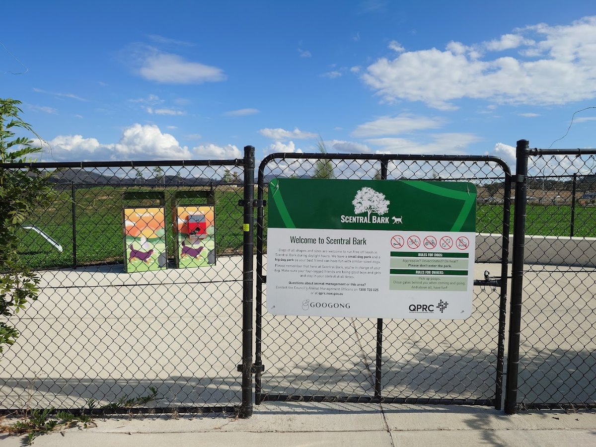 Scentral Bark, also known as Rockley Dog Park, is a comprehensive off-leash facility located in Googong, Australia. This expansive park is thoughtfully designed with separate fenced enclosures for large and small dogs, ensuring a safe environment for all sizes. The terrain is diverse, featuring rolling grassy hills, flat areas covered in wood chips or mulch, and a picturesque pond surrounded by natural reeds and trees. For active dogs, the park includes agility equipment such as large colorful tunnels. Practical amenities are well-provided, including a secure double-gate entry system, waste disposal stations equipped with complimentary bags, and paved walking paths that meander through the space. While the park offers some natural shade from established and newly planted trees, much of the area is open to the sky, providing a bright and airy atmosphere. Benches are scattered throughout for owners to rest while their pets explore the large, undulating landscape. The park's perimeter is secured with sturdy black chain-link fencing, and clear signage outlines the rules to maintain a friendly community environment.