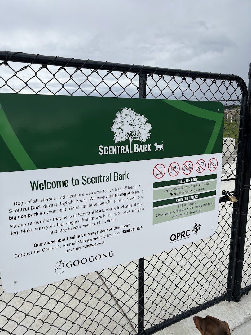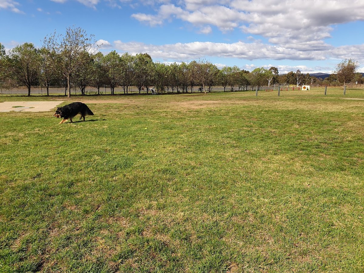 Scentral Bark is a comprehensive off-leash dog facility located in Googong, Australia, managed by the Queanbeyan-Palerang Regional Council. The park is thoughtfully designed with separate fenced enclosures for small and large dogs, providing a safe and tailored environment for different sizes and temperaments. The terrain is expansive and varied, featuring large open grassy fields, areas with wood-chip mulch, and some dirt patches, allowing for diverse play experiences. For physical and mental stimulation, the park is equipped with agility features like large colorful tunnels. The entire perimeter is secured with sturdy black chain-link and metal fencing, featuring gated entry points. Practical amenities for owners include conveniently located waste bag dispensers, themed trash cans, and benches for resting. While the park is largely open, it benefits from natural shade provided by several established trees scattered throughout the landscape. The overall atmosphere is one of a well-maintained community hub, set against a backdrop of rolling hills and a nearby pond, making it an ideal spot for canine exercise and socialization.
