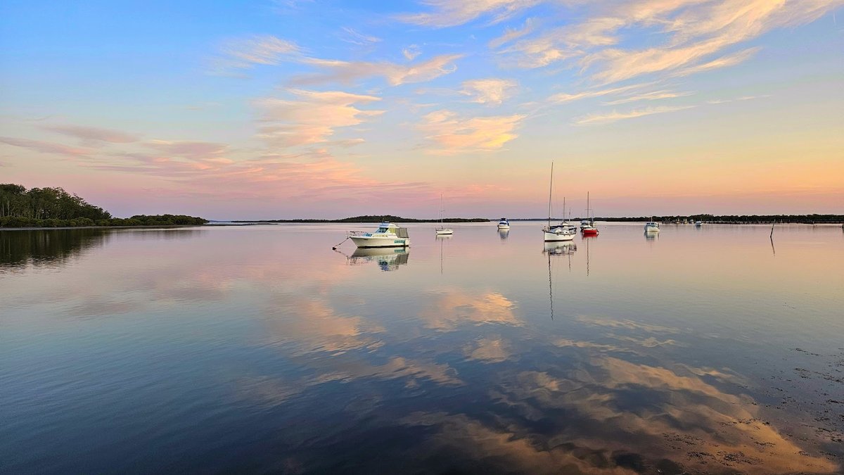 The Karuah Off-Lead Dog Exercise Area is a scenic and expansive public space situated along a tranquil waterfront. The area features a variety of natural terrains, including a well-maintained grassy parkland, a wide sandy beach, and lush wetland sections. The park area is equipped with several amenities, such as a white wooden jetty, a covered picnic shelter with tables, and multiple benches for visitors. Large, mature trees are scattered throughout the park, providing ample natural shade, while the open beach offers a vast space for more active play. The ground surface is a mix of grass and sand, catering to different preferences. While the area is designated for off-lead exercise, there is no visible evidence of perimeter fencing or separate enclosures for different dog sizes, suggesting an open-access environment. The overall atmosphere is peaceful and picturesque, characterized by calm waters and a natural, uncrowded feel. Specific dog-related infrastructure like waste bag dispensers or agility equipment is not clearly visible in the provided images.