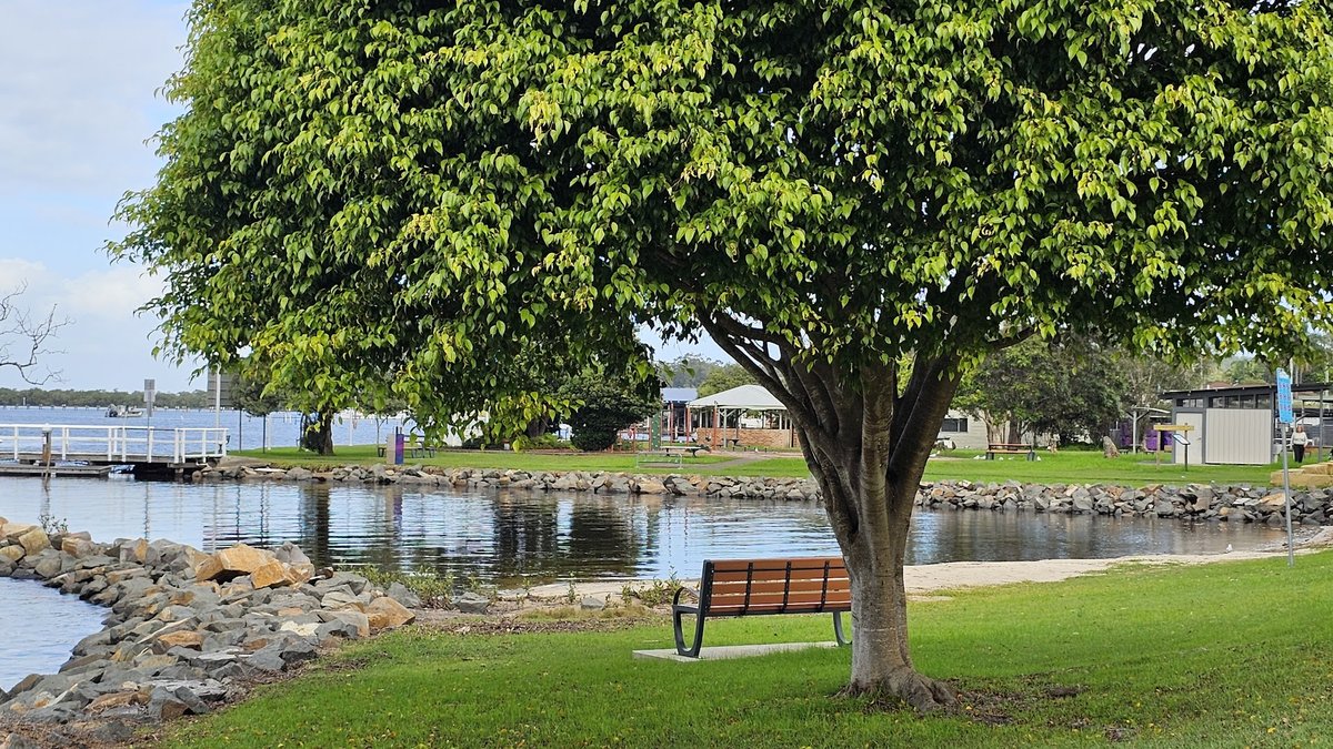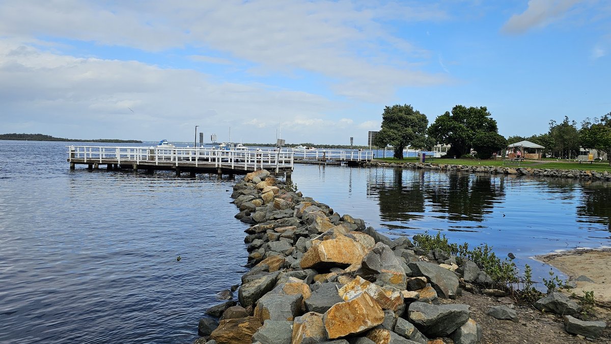 The Karuah On-Lead Dog Exercise Area is a picturesque waterfront park situated along the Karuah River in Australia. The park offers a serene atmosphere with large, open grassy spaces perfect for walking dogs on a leash. It is well-facilitated for visitors, featuring several park benches, picnic tables, and a large covered gazebo that likely houses BBQ facilities. A playground is also present, indicating a multi-use community space. The park is characterized by its natural beauty, with mature shade trees, a jetty extending into the water, and nearby bushland. The terrain is predominantly flat and covered in well-maintained grass, though the shoreline is lined with a rocky breakwater. While the area lacks a fenced enclosure or specific agility equipment for dogs, its size and scenic views make it an attractive spot for a leashed stroll. Public toilets are available in a nearby building within the park grounds, ensuring convenience for all visitors.