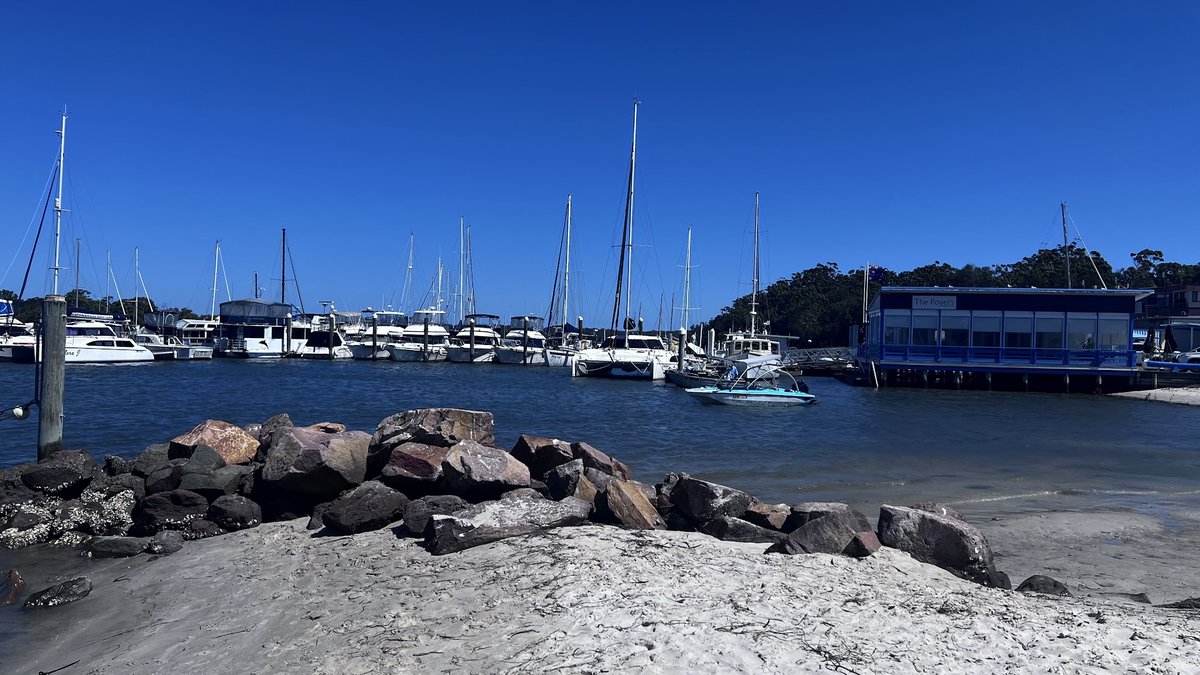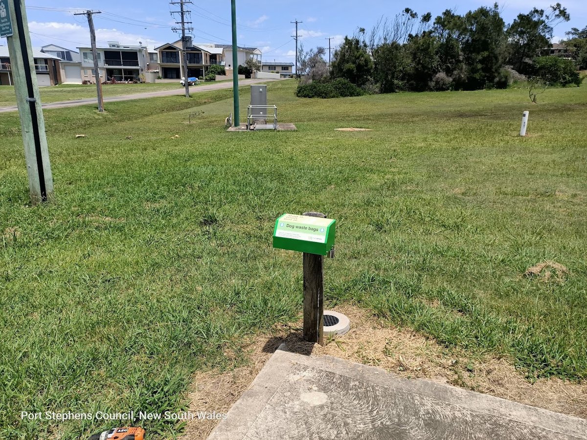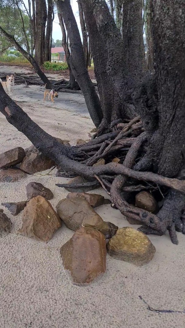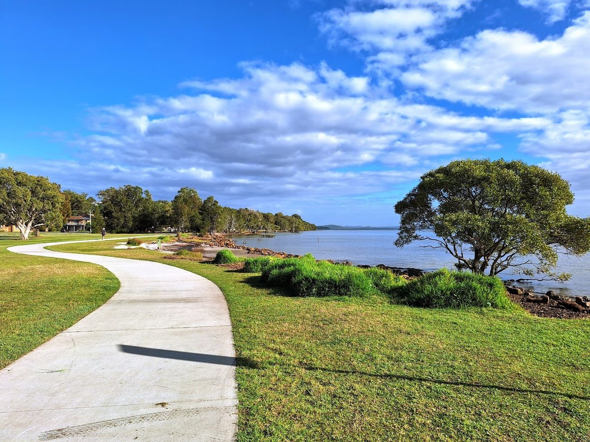 Kooindah Park Off-Lead Dog Exercise Area is a spacious, scenic waterfront park located in Lemon Tree Passage, New South Wales. The park features expansive, well-maintained grassy fields perfect for dogs to run and play. A prominent feature is the long, winding concrete pathway that follows the shoreline, offering beautiful views of the water and nearby marina. The park provides essential amenities for dog owners, including a dedicated dog waste bag dispenser. While the area is designated for off-lead exercise, it is not fully fenced, transitioning naturally into sandy beach areas, rocky shorelines, and wooded sections with mature trees that provide natural shade. The atmosphere is tranquil and open, shared with local birdlife like ibises. There are no visible agility equipment, dedicated small dog areas, or specialized lighting. The terrain is mostly flat with some gentle slopes and varied surfaces including grass, sand, and paved paths. It is an ideal spot for a long walk with a pet in a picturesque coastal setting.