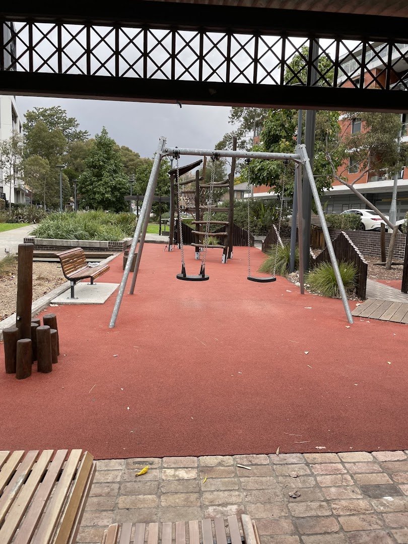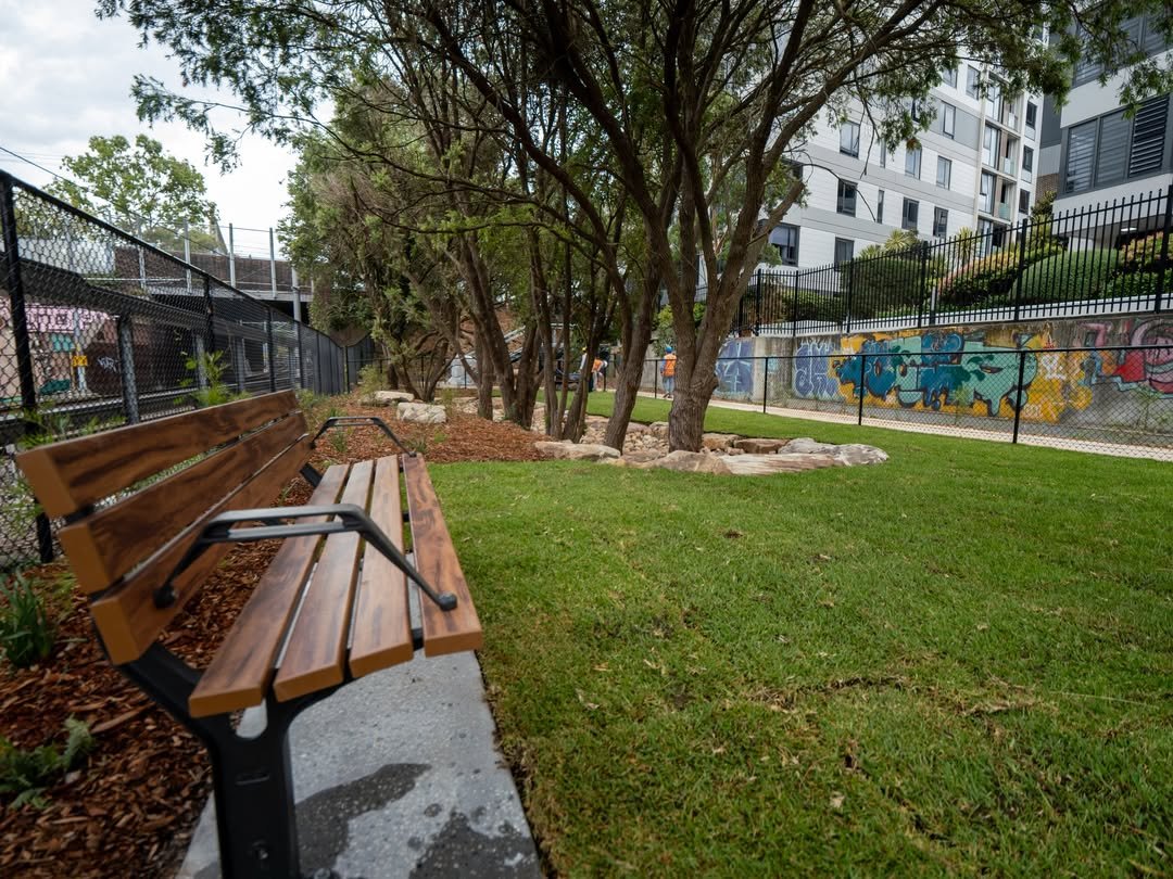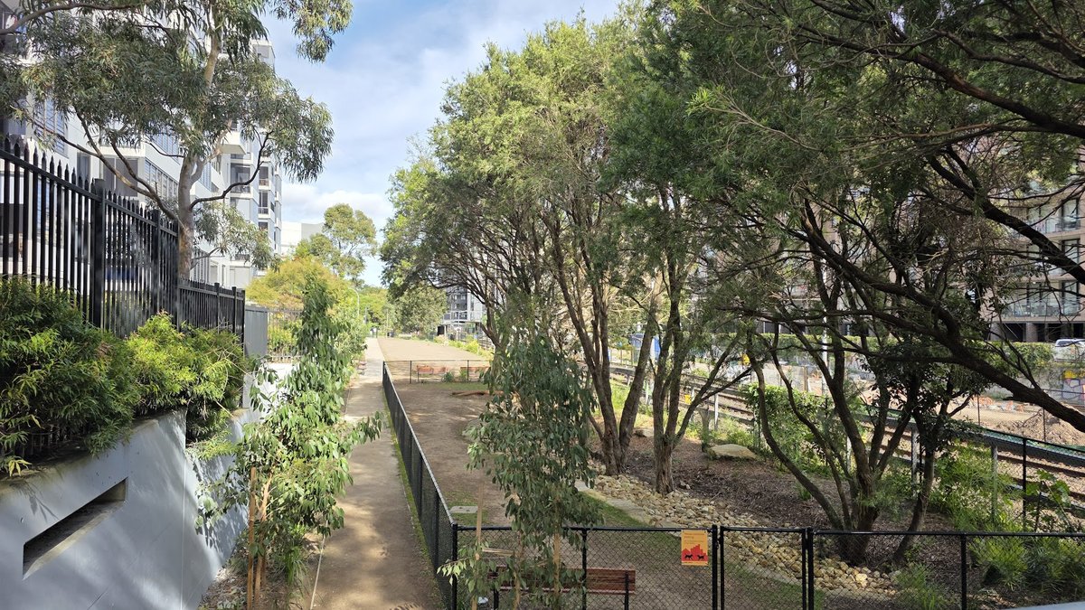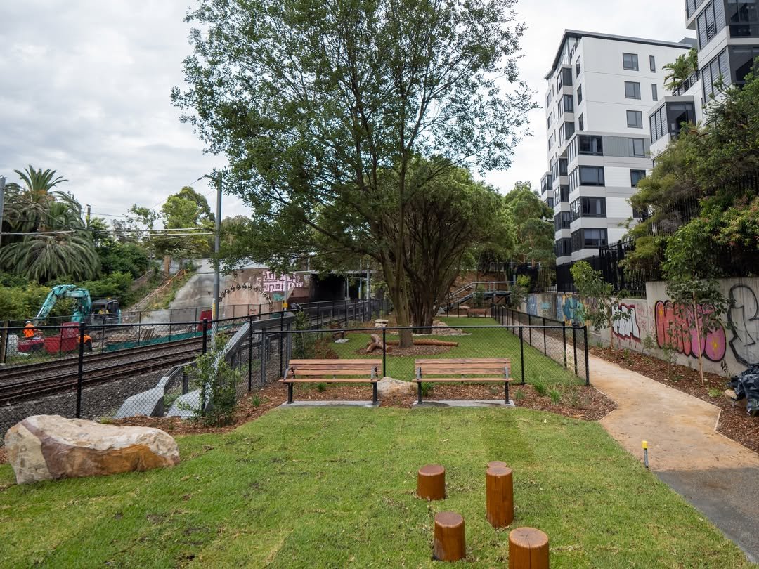 The Lewisham West dog off-leash area is a purpose-built, linear urban park nestled between a railway line and contemporary residential developments. This narrow but functional space is fully enclosed by secure black chain-link fencing, ensuring a safe environment for dogs to exercise off-leash. The park's terrain is a mix of surfaces; newer sections boast lush green grass and landscaped rock edges, while other areas feature more durable dirt and mulch. Significant natural shade is provided by a variety of mature trees that line the length of the run, making it comfortable during warmer days. For human visitors, several sturdy wooden and metal benches are strategically placed throughout the area. Essential amenities are well-provided, including a dedicated dog water station with an integrated bowl, and specialized waste bins equipped with bag dispensers to encourage cleanliness. While the park lacks large open fields for long-distance fetching, its unique corridor-like layout offers a great space for social interaction and scent work. An adjacent playground area with rubber soft-fall surfacing is available for families, though it remains separate from the dog-specific enclosure.