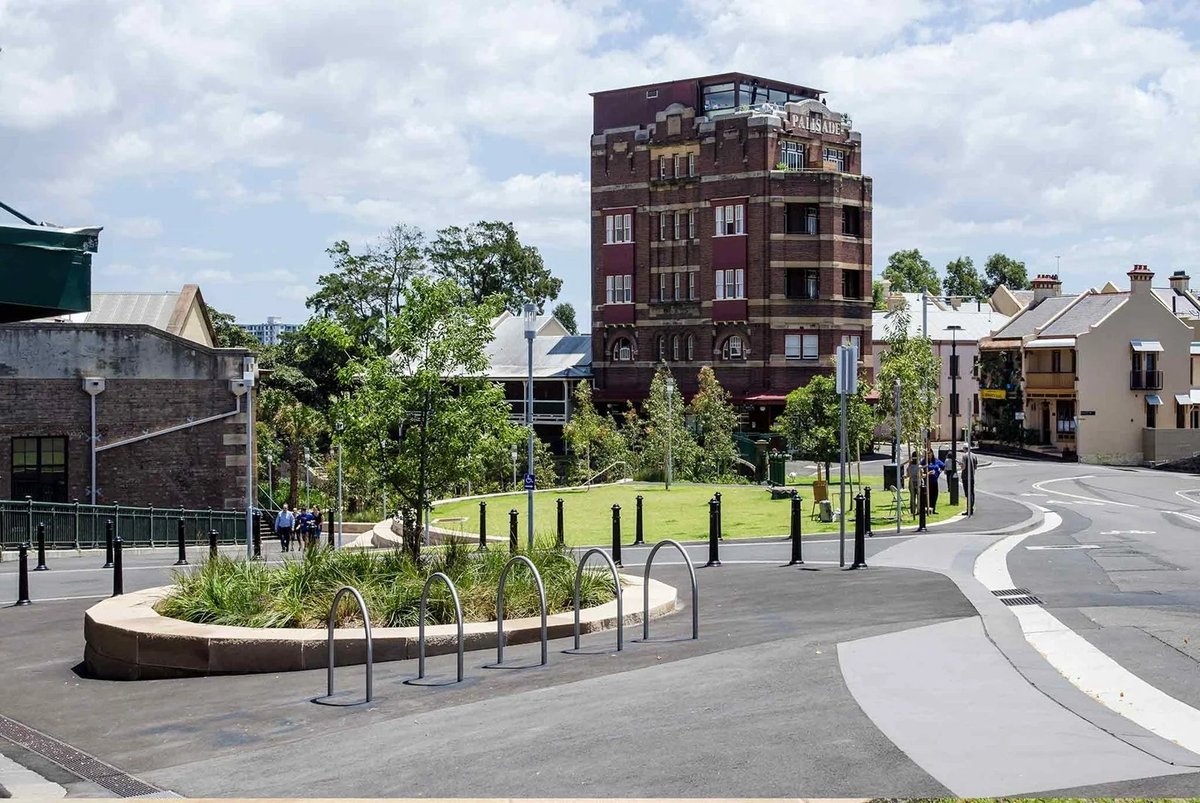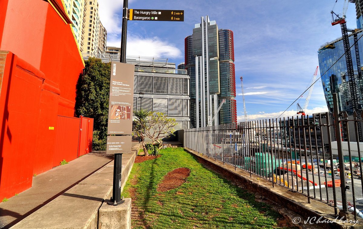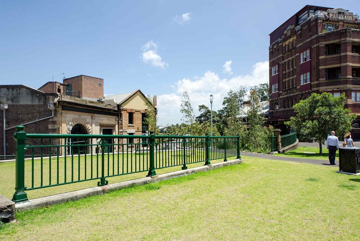 Munn Reserve is a picturesque urban park located in Millers Point, Sydney, offering stunning views of the Harbour Bridge and city skyline. The park features a mix of open grassy areas and paved pathways, set against a backdrop of historic architecture like the Palisade Hotel and modern skyscrapers. Facilities include wooden benches, a shaded picnic area under a lush vine-covered pergola, and trash cans. The park is partially enclosed by decorative green metal fencing. While it serves as a thoroughfare and a spot for relaxation, it also functions as a dog-friendly space with designated off-leash areas as indicated by local signage. The terrain is relatively flat with some gentle slopes and stone steps. Mature trees provide some natural shade, complemented by built structures. The atmosphere is a blend of historic charm and modern urbanity, making it a popular spot for both locals and visitors to enjoy the harbor views.