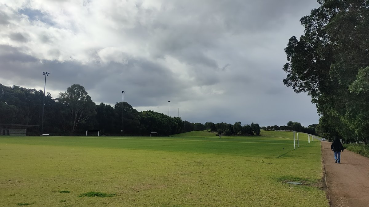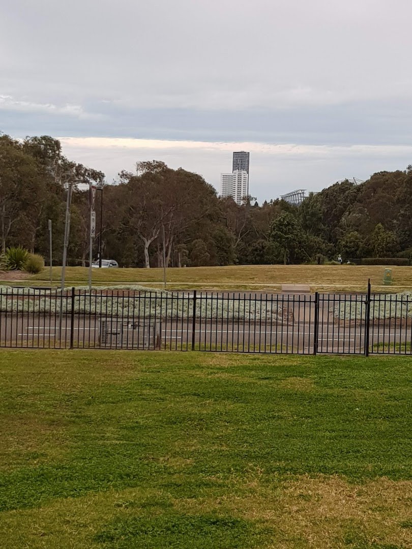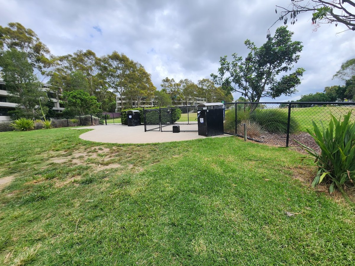 Pierre De Coubertin Dog Park in Australia offers a mix of dedicated fenced enclosures and expansive open fields, making it suitable for various canine activities. The park features a well-maintained chain-link fence with a secure double-gate entry system to facilitate safe off-leash exercise. The primary ground surface is natural grass, complemented by concrete walking paths that navigate through the park. Amenities include several park benches for seating and conveniently placed trash cans for waste disposal. While the park lacks specialized agility equipment, its large open spaces, including adjacent sports fields with soccer goals, provide ample room for running. Mature trees surrounding the perimeter offer patches of natural shade, and the presence of tall floodlights indicates the area is equipped for use during low-light conditions. The park's setting is suburban, bordered by residential complexes and featuring a gentle slope in certain sections. It provides a functional environment for local dog owners, though some fixtures like benches show signs of wear and graffiti.