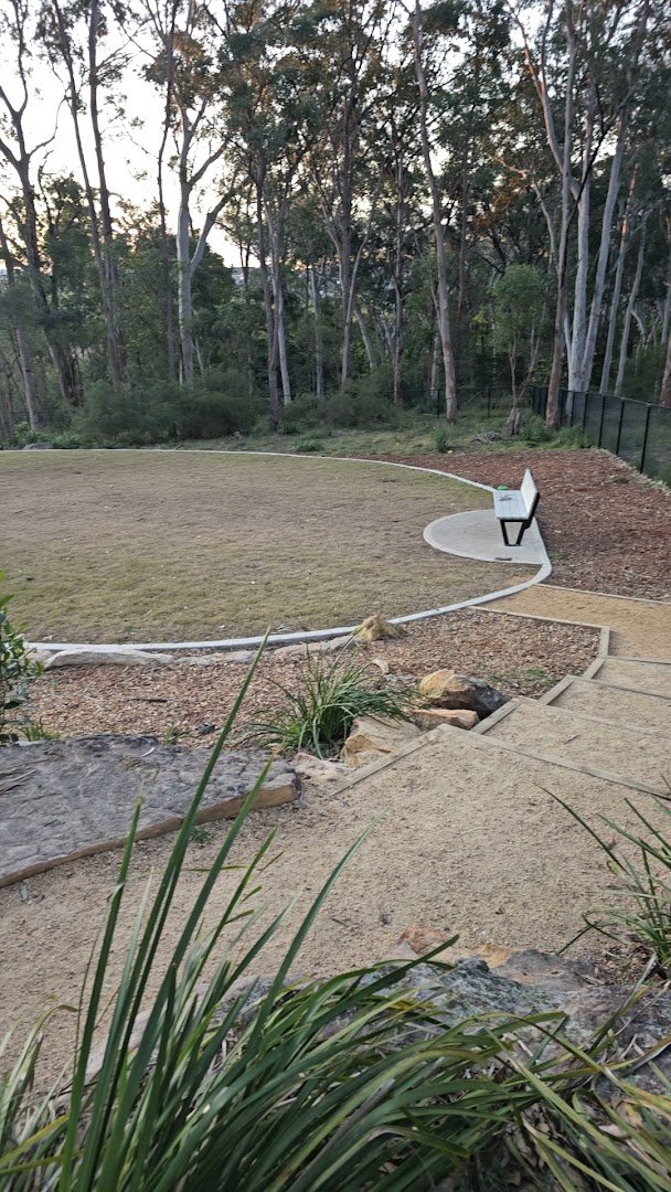 Indwarra Avenue Reserve Off Leash Dog Park offers a spacious and natural environment for dogs to exercise and socialize. The park features a large, open grassy field, which is well-maintained and provides ample room for running and playing fetch. Mature eucalyptus trees are scattered throughout and line the perimeter, offering significant natural shade and a serene, bushland atmosphere. The facility is fully enclosed with black chain-link fencing, ensuring a secure environment for off-leash activities. The ground surface is primarily grass, but also includes areas with woodchips and well-defined concrete paths for easy accessibility. For human visitors, several benches and seating options are strategically placed around the park, including a circular grassy area with a dedicated bench. The park's terrain includes some gentle slopes and tiered sections connected by stairs. While the park is adjacent to residential areas and a childcare center, it maintains a peaceful feel. The expansive space and natural setting make it a popular spot for local dog owners seeking a quiet outdoor retreat.
