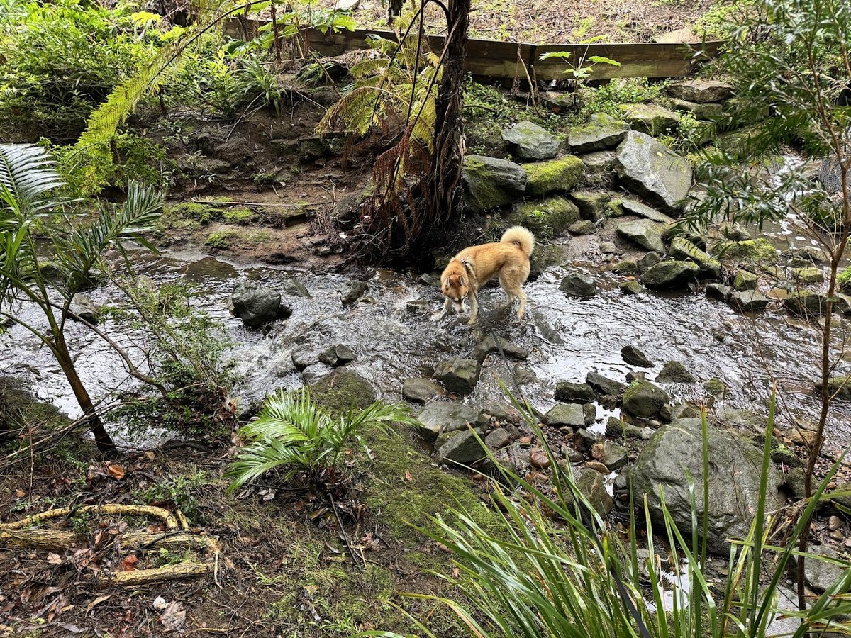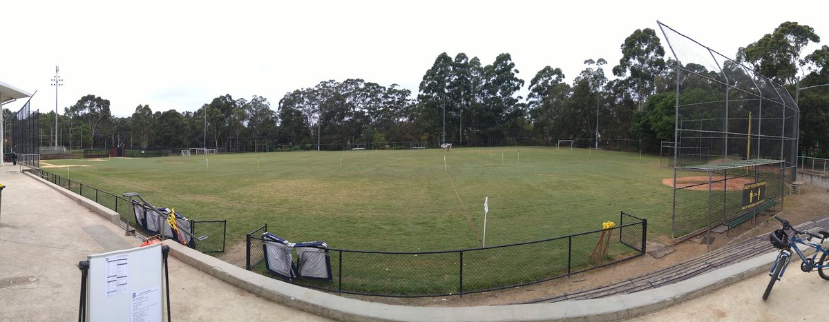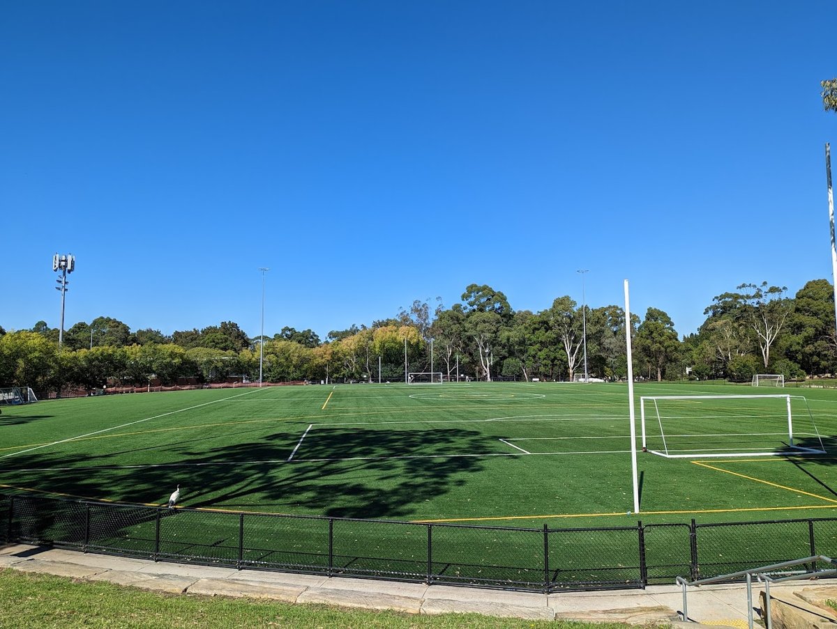 ELS Hall Park is a comprehensive multi-purpose recreational facility located in Australia, offering a diverse range of amenities for various activities. The park features expansive sports fields, including a high-quality artificial turf soccer pitch and a well-maintained baseball diamond with a grass outfield and dirt infield. For families, there is a modern, colorful playground set on a safe woodchip surface, surrounded by mature trees that provide natural shade. The park also includes large, open grassy areas that offer ample space for running and play. A natural creek area with rocky terrain and lush vegetation provides a scenic spot for leashed walks, as evidenced by a dog exploring the stream. Facilities such as benches and bleachers are available for spectators and rest. The sports fields are equipped with tall lighting towers, suggesting the park is used for evening events. Perimeter fencing, primarily chain-link, is present around the specialized sports areas to ensure safety and containment. The overall atmosphere is vibrant and community-oriented, catering to athletes, families, and pet owners alike in a spacious, well-kept environment.