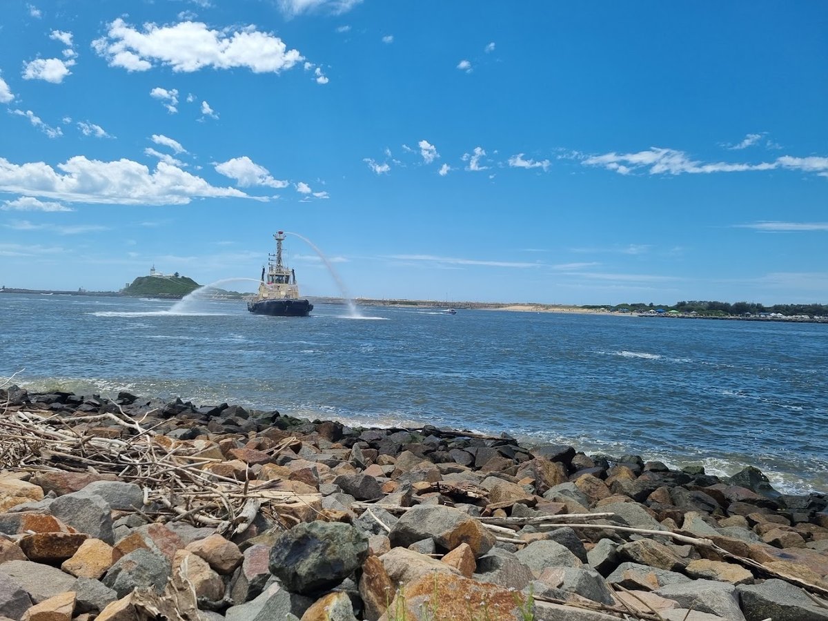 Little Beach is a scenic, open-air dog-friendly coastal area located near a harbor entrance, characterized by its sandy shoreline and proximity to a breakwater. The park offers a large, expansive space for dogs to run and swim, with visible evidence of off-leash activity. The ground surface is primarily sandy on the beach, transitioning to grassy verges and a paved concrete walkway along the breakwater. Natural driftwood is scattered across the sand, adding to the rugged, coastal atmosphere. While the area provides a beautiful environment for exercise with views of the iconic Nobbys Lighthouse and passing maritime traffic, there are no visible fenced enclosures, shade structures, or specialized dog park facilities like agility equipment or water stations in the provided images. Lighting is present along the paved path, suggesting accessibility during twilight hours. The atmosphere is tranquil yet dynamic, given the active shipping lane nearby. This location is ideal for owners seeking a natural environment rather than a structured park, offering plenty of room for dogs to explore the shoreline and interact with the water.