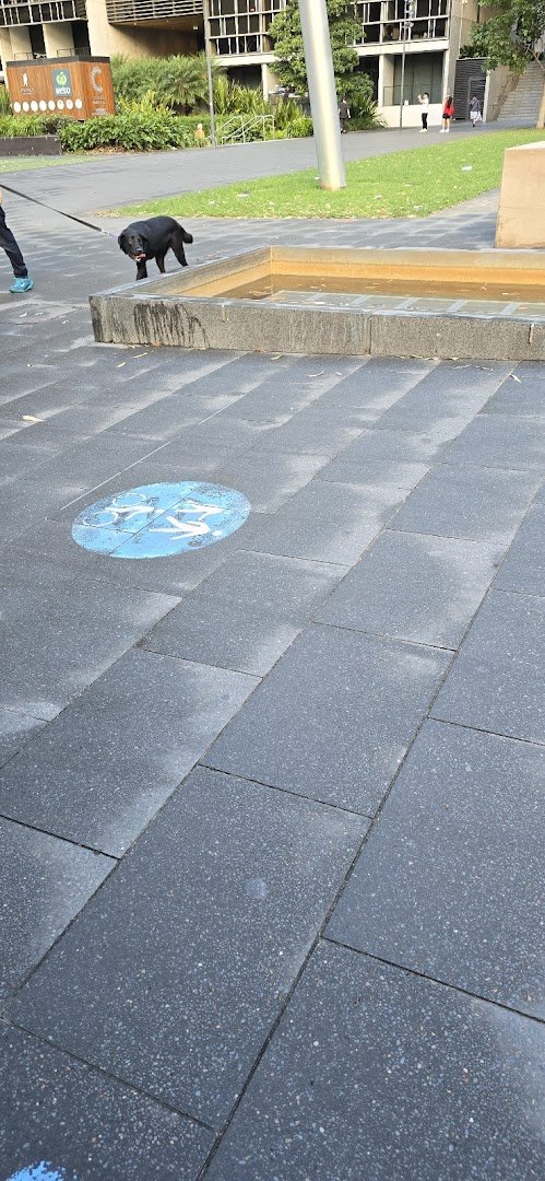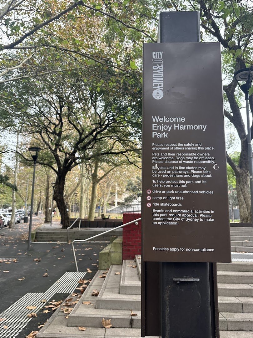 Harmony Park is a contemporary urban green space situated in Sydney, Australia, providing a versatile environment for both residents and their pets. The park is notably dog-friendly, with official City of Sydney signage confirming that dogs are permitted to be off-leash, making it a popular spot for local pet owners. The landscape features expansive, well-maintained grassy fields ideal for exercise, complemented by a network of paved brick and concrete pathways for pedestrians and cyclists. Facilities are well-integrated into the design, including traditional wooden benches, unique modern sculptural seating, and a dedicated shaded picnic area sheltered by a lush, vine-covered pergola. While the park offers a large open space with a gentle slope and mature trees providing natural shade, it is not fully enclosed by fencing, maintaining an open connection to the surrounding city streets and skyline. Additional visible amenities include a shallow water feature and tall lamp posts for evening illumination. The overall atmosphere is welcoming and multi-functional, successfully balancing recreational space for people with a safe, off-leash environment for dogs within a dense urban setting.