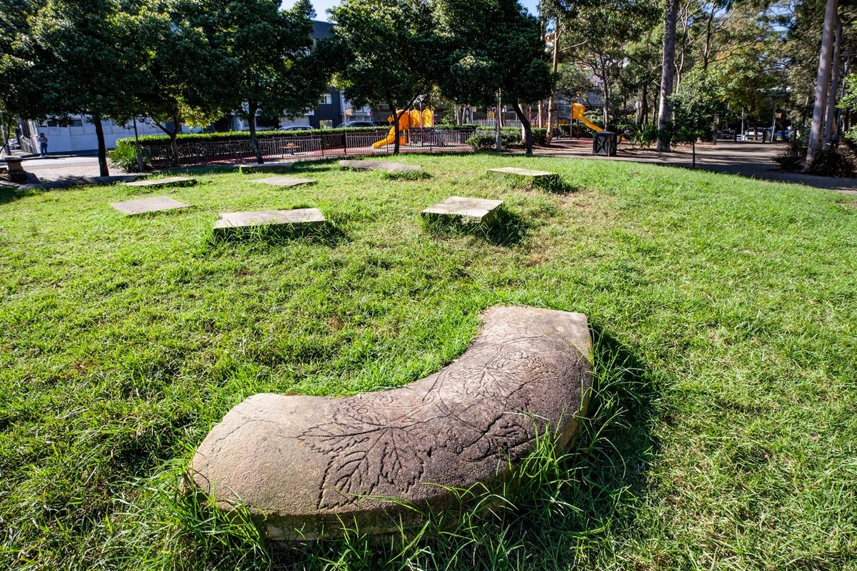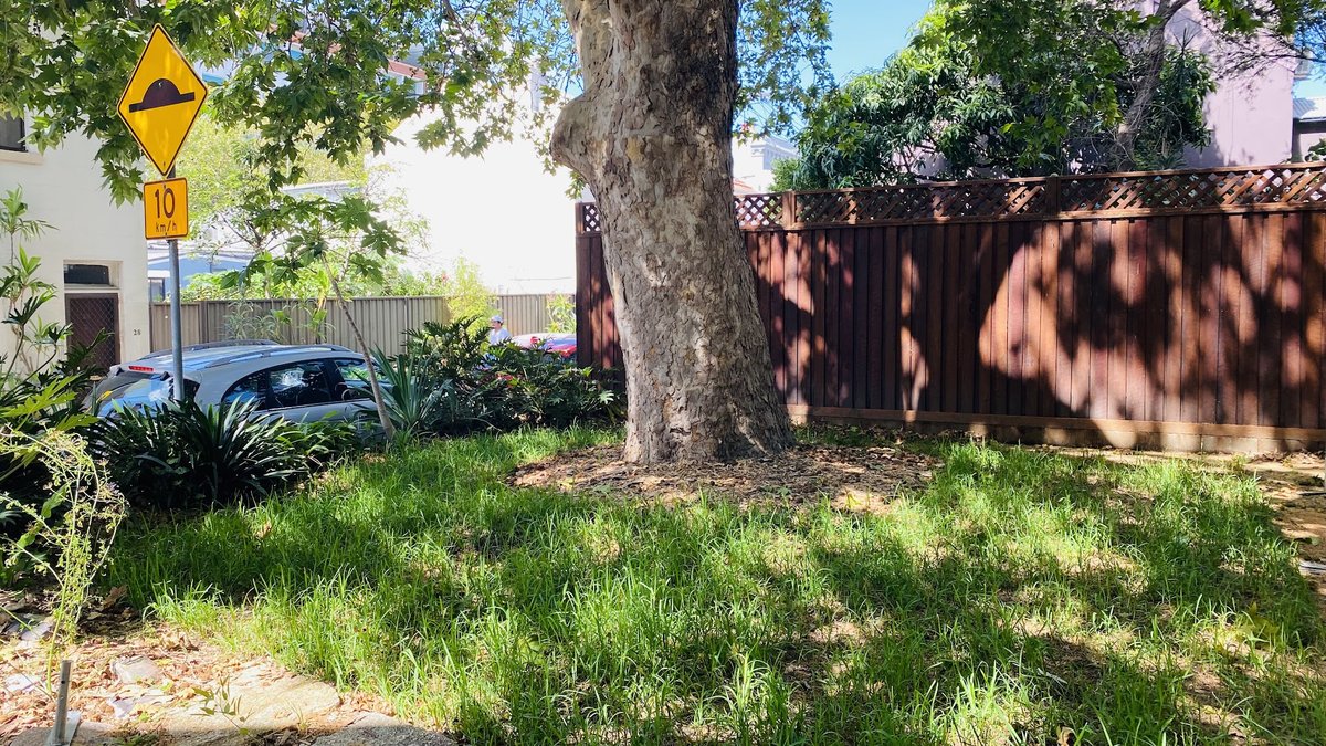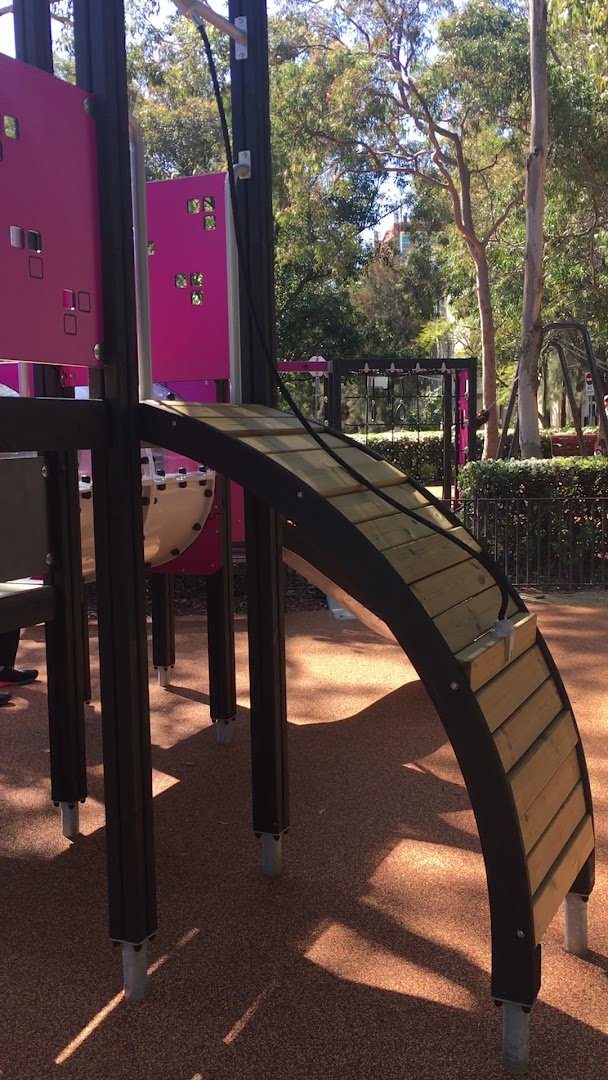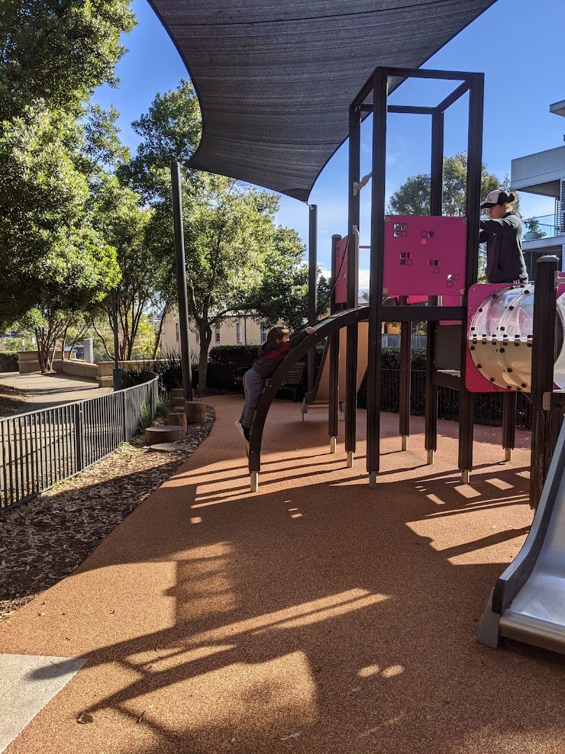 Fig Lane Park, also known as Fig Lane Reserve, is a well-maintained urban green space in Australia. The park features a variety of ground surfaces, including open grassy lawns, paved walkways, and a specialized rubberized safety surface within the children's playground area. A key facility is the fenced-in playground, which is equipped with modern climbing structures and protected by a large overhead shade sail. Mature trees throughout the park provide ample natural shade, complemented by a vine-covered pergola with bench seating. Other visible amenities include trash cans, park benches, and street-style lighting poles. A small, shallow water feature is located in a paved section of the park. While dogs are seen in the park, they appear to be on-leash, and there is no evidence of a dedicated off-leash area or agility equipment. The park's atmosphere is peaceful and family-oriented, serving as a pocket of nature within a built-up environment. The perimeter is partially defined by metal fencing and wooden residential fences.