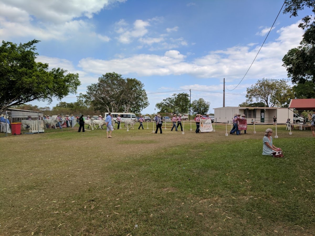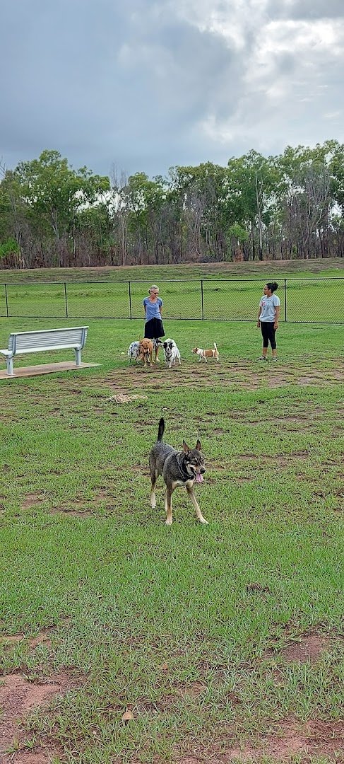 The DogsNT DODC Showgrounds Area in Australia offers a spacious and functional environment for dogs and their owners. Based on the images, the facility features large, dedicated off-leash zones enclosed by sturdy black chain-link fencing, ensuring a secure space for exercise. The primary ground surface is natural grass, which appears well-maintained in some sections while showing patches of dirt in high-traffic areas. Mature, leafy trees are scattered throughout and along the perimeter, providing ample natural shade for both pets and people. For visitor comfort, the park includes amenities such as metal benches situated on concrete pads and accessible trash cans for waste management. The overall atmosphere is one of a versatile community hub; the showgrounds are large enough to host diverse activities, from casual dog playgroups to organized events involving livestock. The terrain is predominantly flat, offering a clear line of sight across the expansive fields. While specific agility equipment or water stations aren't immediately visible in these views, the sheer scale of the open space makes it an ideal location for high-energy dogs to run freely.
