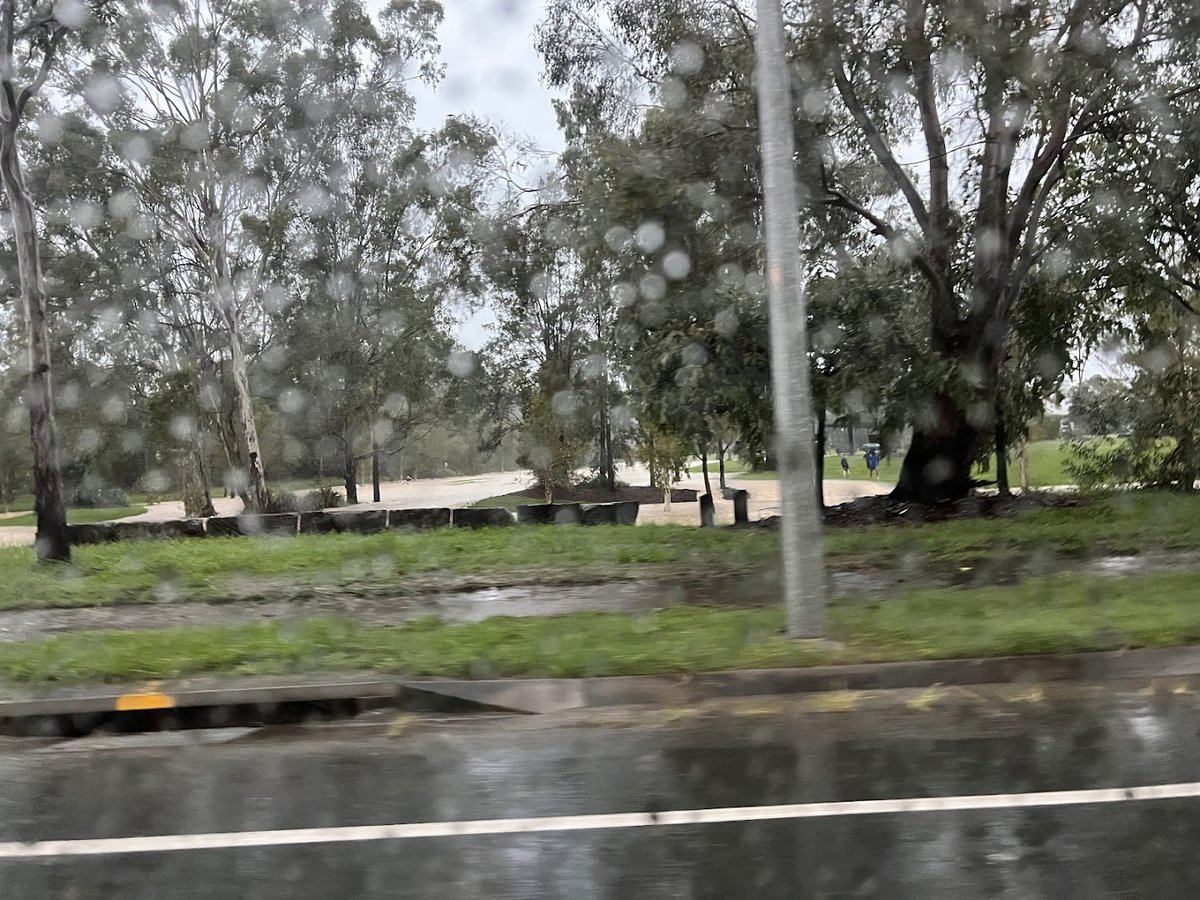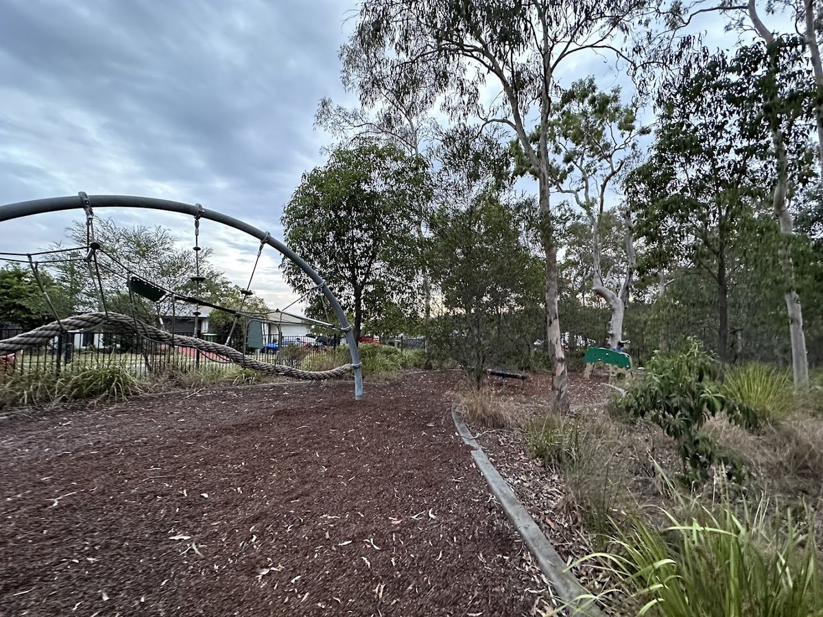 Jane Gorry Park is a spacious and well-equipped community park featuring a dedicated off-leash dog area. The dog park section is fully enclosed with black metal mesh fencing, providing a secure environment for pets to run and play. The ground surface is primarily natural grass, which appears well-maintained, though some areas may become muddy after rain. Facilities within the dog area include a water fountain for pets, a park bench for owners, and a picnic table. Mature trees are scattered throughout the park, offering ample natural shade. Beyond the dog-specific area, the park includes a children's playground with climbing equipment and woodchip surfacing, as well as concrete walking paths. The overall atmosphere is peaceful and natural, often frequented by local birdlife like Galahs. The park's large open spaces make it ideal for active dogs, while the surrounding bushland provides a scenic backdrop for visitors.