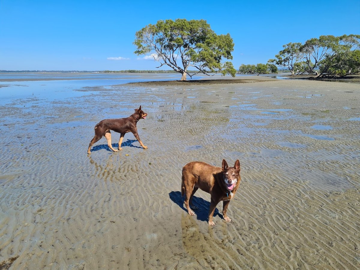 Bellara Dog Park is a picturesque off-leash area located along the waterfront in Bellara, Australia. The park offers a diverse environment for dogs, featuring expansive grassy fields and wide sandy beaches that transition into tidal flats. This combination provides plenty of room for dogs to run and explore. Natural shade is abundant, thanks to numerous mature trees scattered throughout the grassy sections, where dogs can be seen resting. The park's atmosphere is serene, particularly during sunset, offering beautiful views of the water and the Bribie Island Bridge in the distance. While the area is popular for off-leash activities, no fencing is visible in the images, indicating an open-access park rather than a contained enclosure. Facilities include a convenient parking lot adjacent to the green space and some picnic tables or benches for visitors to use. The ground surface is a mix of well-maintained grass and natural sand. Overall, it is a spacious and scenic destination for dog owners seeking a natural coastal setting.