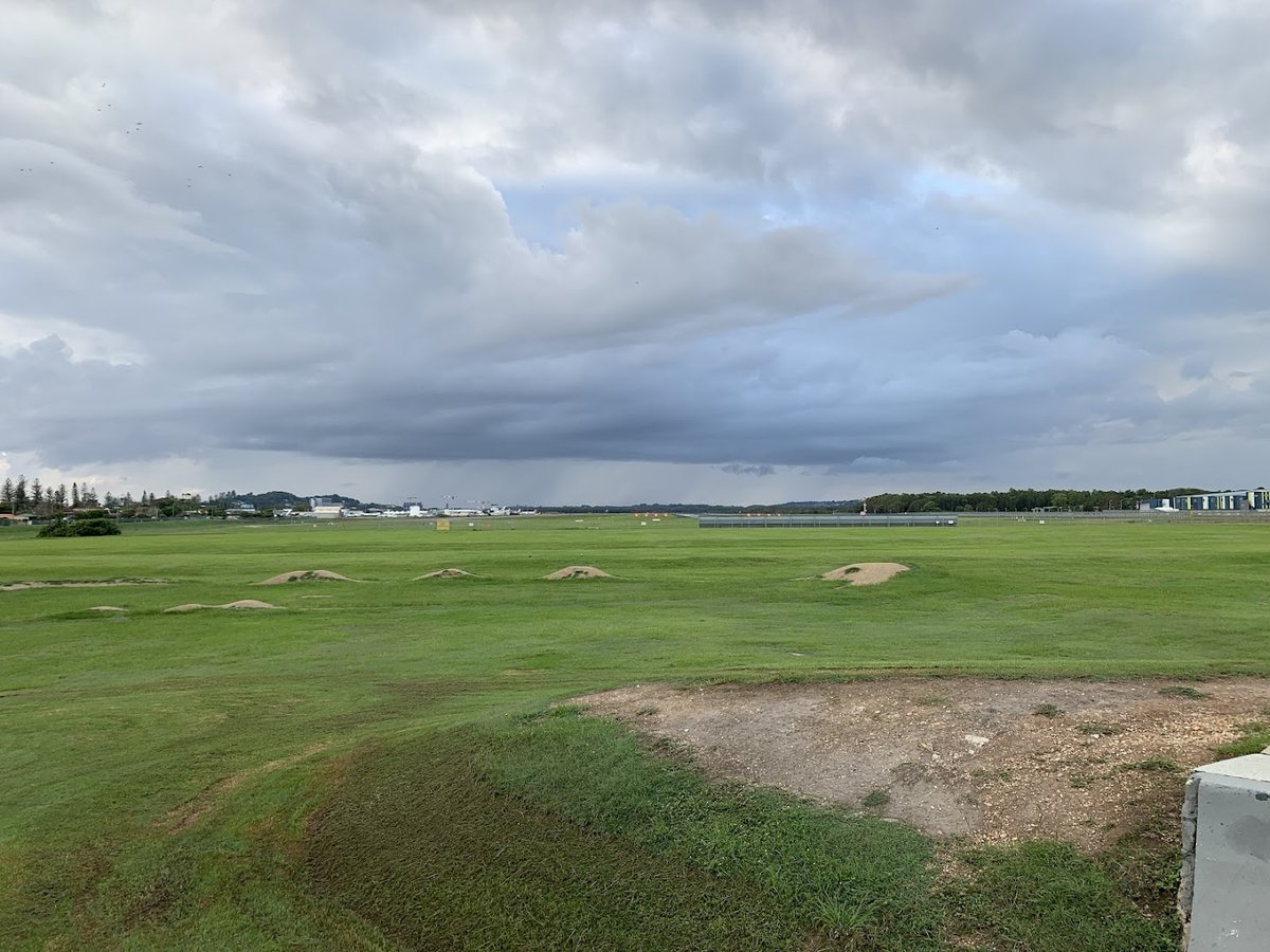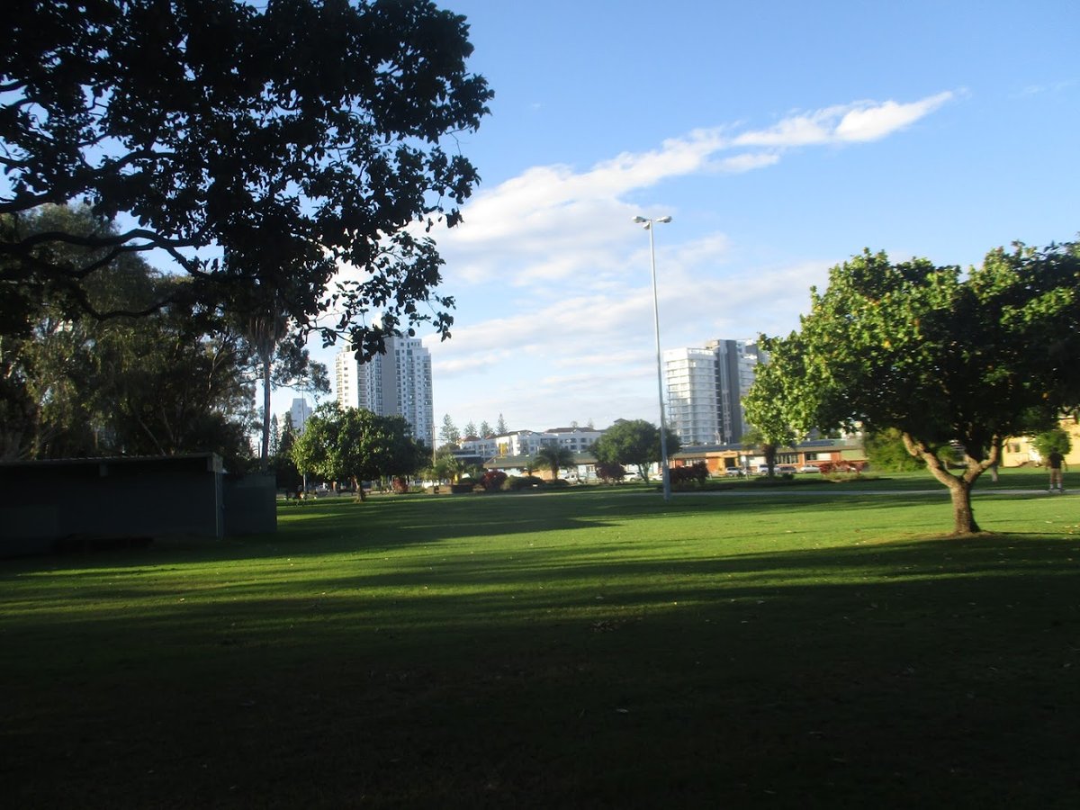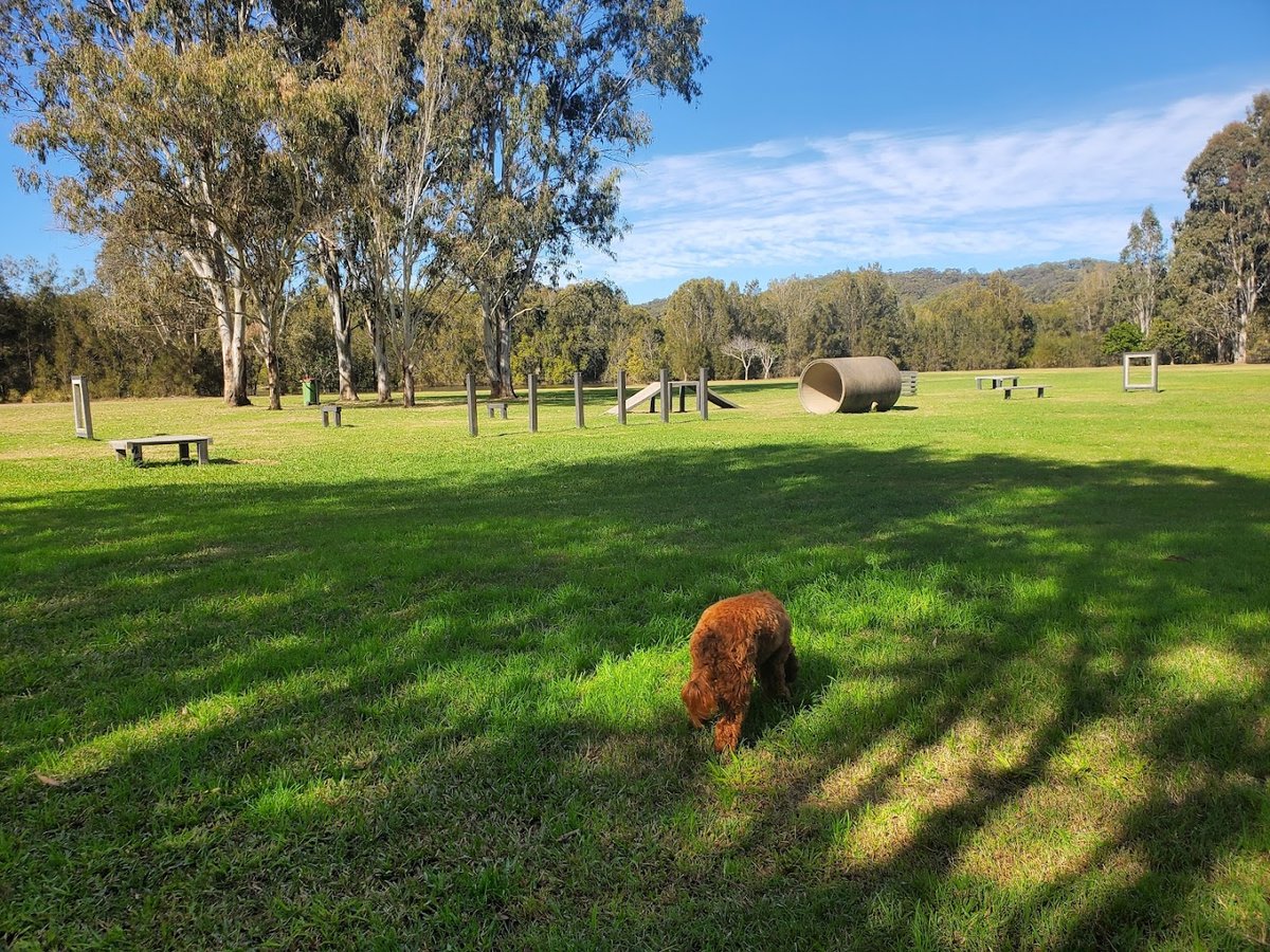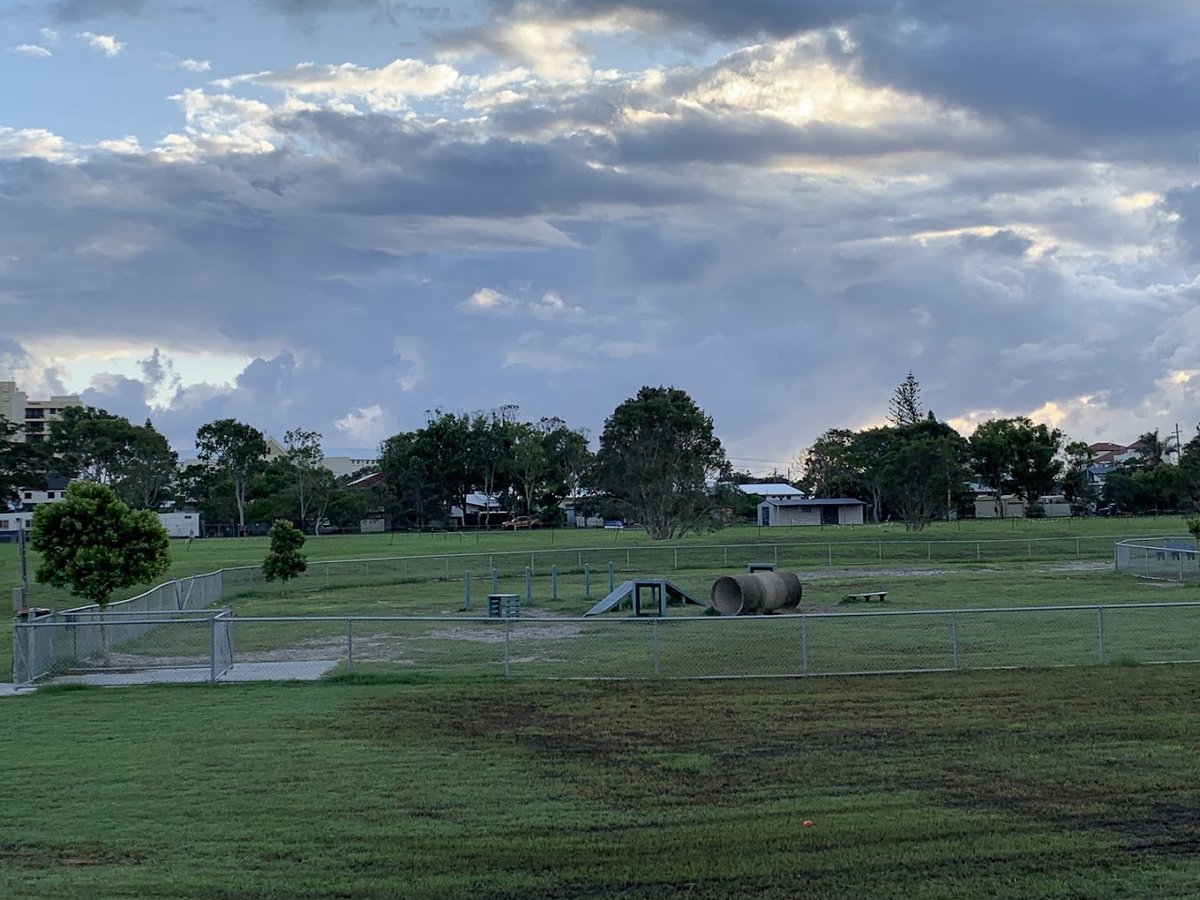 The Buddies HQ Tugun dog park offers an expansive and versatile environment for dogs and their owners. The facility features a very large, open grassy field that provides ample room for long-distance running and fetch. For more structured play, there is a dedicated fenced-in area constructed with chain-link fencing, which includes a variety of agility equipment such as a large concrete tunnel, an A-frame ramp, weave poles, and jumping platforms. The ground surface is predominantly well-maintained grass, though some natural dirt patches and mounds are present in the larger open spaces. Mature trees are scattered throughout the park, offering significant natural shade for visitors. The park's location is particularly scenic, situated near the coastline with views of the beach and city skyline, and it includes practical amenities like trash cans for waste disposal. The presence of a double-gate entry system in the fenced section ensures a secure environment for off-leash activity. Overall, the atmosphere is one of a spacious, well-equipped community hub that caters to both high-energy exercise and skill-based training in a beautiful coastal setting.
