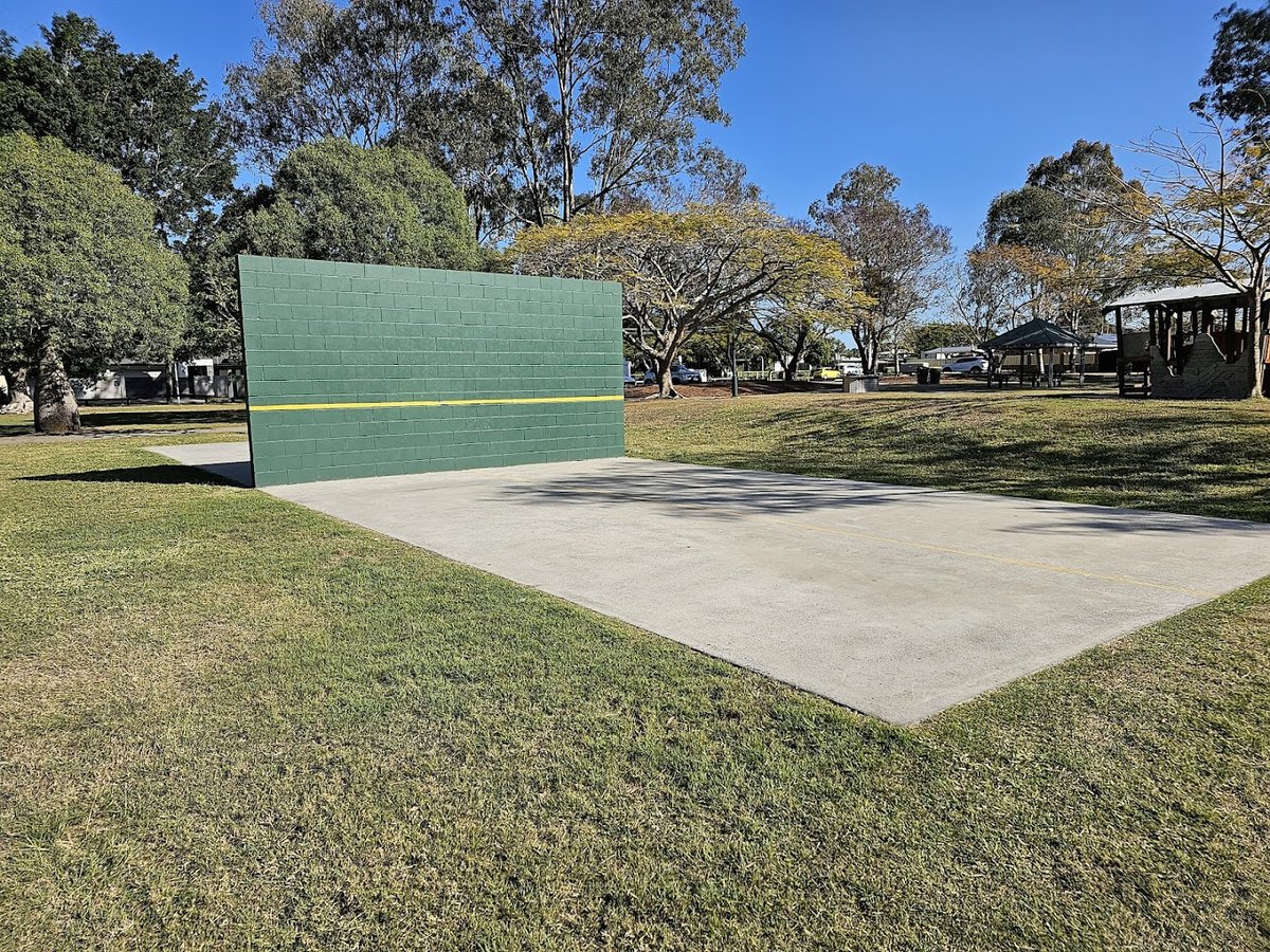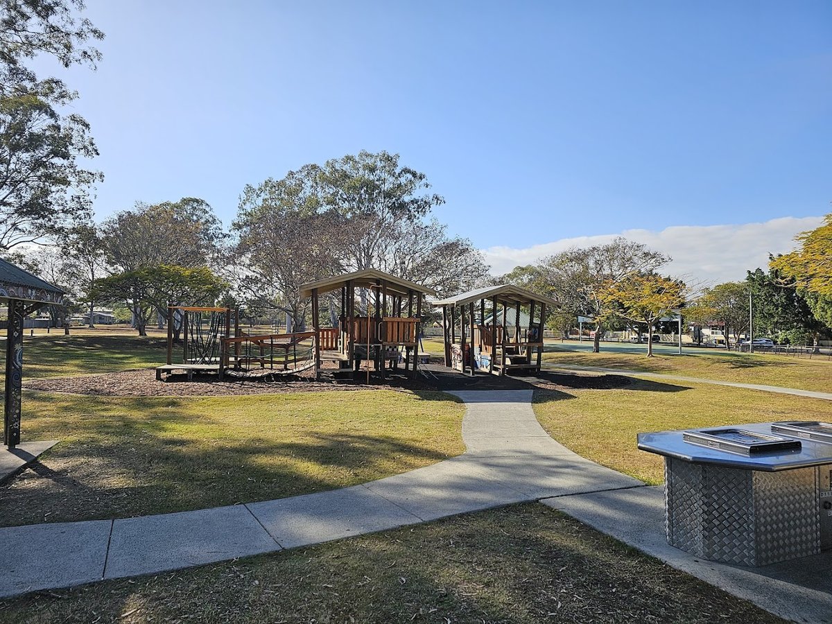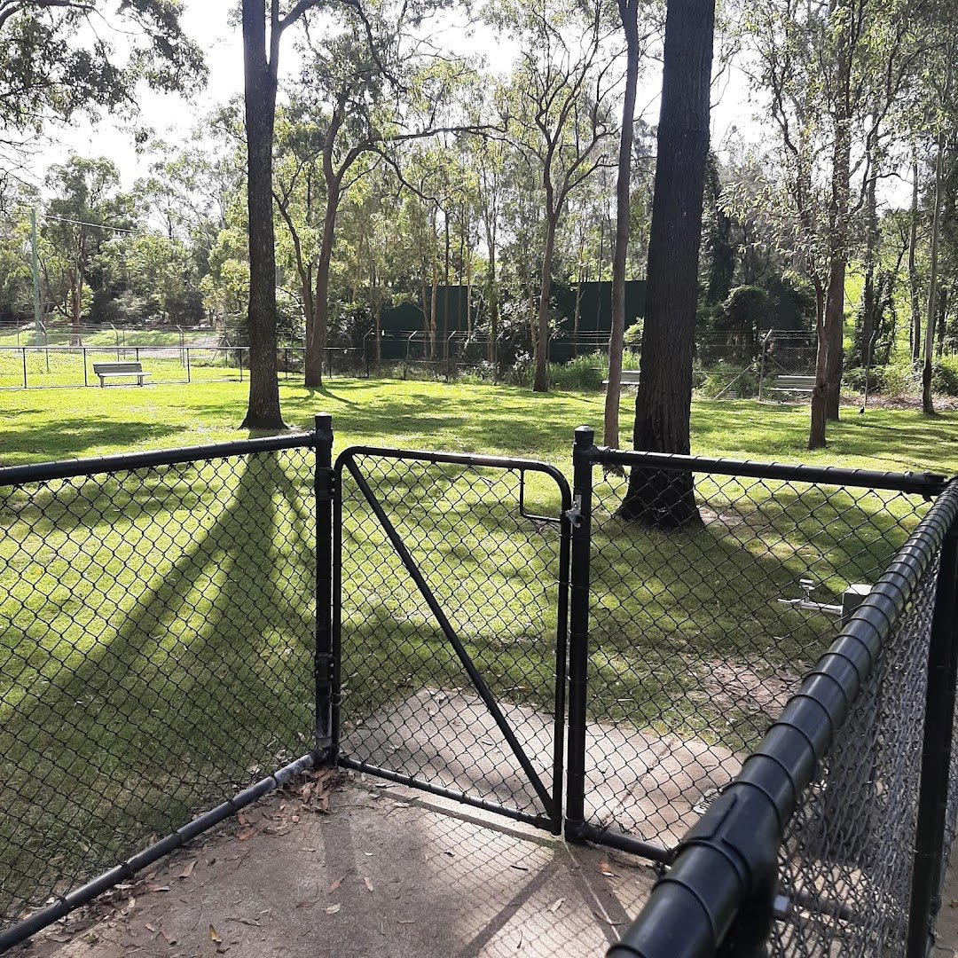 Mulbeam Park Dog Off-Leash Area is a spacious and well-maintained community facility located in Australia, offering a variety of amenities for both pets and their owners. The primary feature is a large, fully fenced grassy enclosure that allows dogs to exercise safely off-leash. This area is heavily wooded with mature trees, providing ample natural shade and a pleasant, park-like atmosphere. Inside the fenced zone, there are several park benches for owners to relax and a dedicated water station to ensure dogs stay hydrated. The entrance is secured with a sturdy metal gate system. Adjacent to the dog park, the broader Mulbeam Park includes a wealth of recreational facilities. There is a modern playground with multiple climbing structures, a sheltered picnic area with tables, and public BBQ grills. Additionally, the park features a concrete rebound wall for ball games and paved pathways that weave through the grounds. The terrain is mostly flat and covered in lush green grass, making it a versatile space for various outdoor activities and family gatherings.