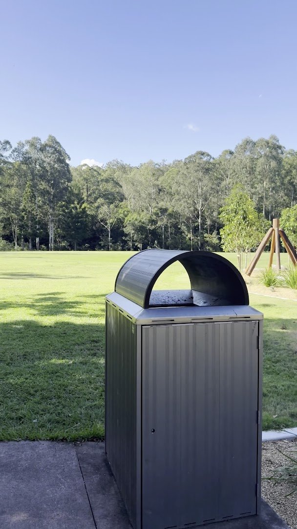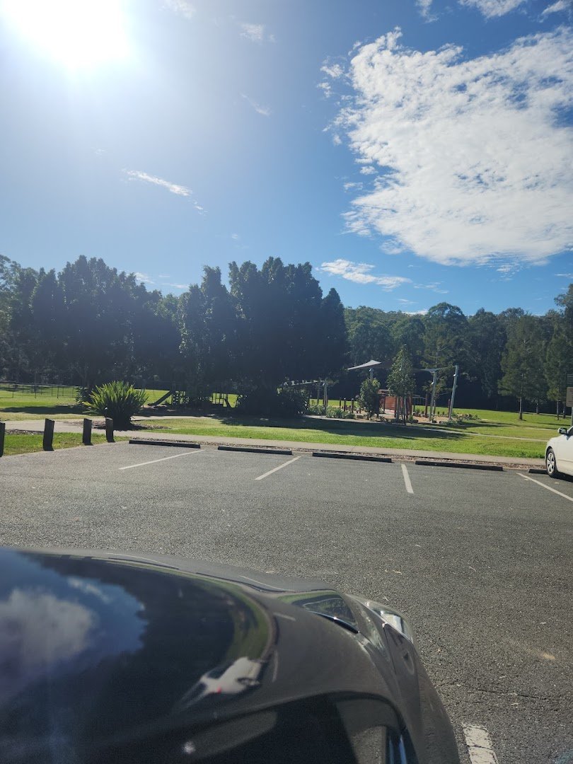 Opossum Creek Dog Park is a spacious and well-equipped facility nestled within a larger natural rehabilitation and revegetation project area in Australia. The park features multiple securely fenced-off sections, including a clearly marked off-leash area accessible via a gated entry system. The ground surface is primarily natural grass, which provides a soft running area for pets, though it can appear dry or patchy depending on the season. Visitor amenities are plentiful, featuring several park benches, picnic tables, and man-made shaded pavilions for owners to relax. For the dogs, there are dedicated water stations and bowls to ensure they stay hydrated. The park is beautifully integrated with its environment, surrounded by many mature, tall trees that offer significant natural shade across the play areas. Beyond the dog-specific zones, the site includes a modern children's playground with unique wooden climbing structures and wood-chip surfacing. A dedicated asphalt parking lot provides convenient access for visitors. The overall atmosphere is serene and expansive, offering a safe and scenic environment for dogs to exercise and socialize.