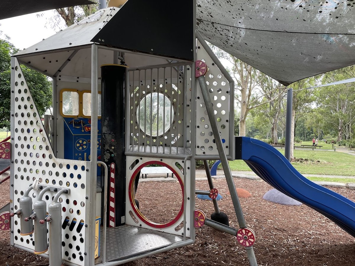 Carindale Reserve Dog Park in Australia is a versatile community space that caters to both pet owners and families. The park's primary feature for canine visitors is a sprawling, open grassy field that provides ample room for off-leash running, fetching, and socialization. This large space is bordered by fencing, ensuring a secure environment for dogs to play. The terrain is predominantly flat with some gentle slopes and is well-maintained with natural grass. For families, the park includes a modern playground area highlighted by a distinctive rocket-ship climbing structure and a blue slide. This play zone is equipped with rubberized safety matting and wood chip surfaces to ensure child safety. Significant shade is provided by both large, professional-grade shade sails over the playground and numerous mature trees scattered throughout the reserve. Seating is available in the form of concrete blocks and traditional benches, allowing visitors to rest while supervising their pets or children. The overall atmosphere is vibrant and active, making it a popular local spot for outdoor recreation in a suburban setting.