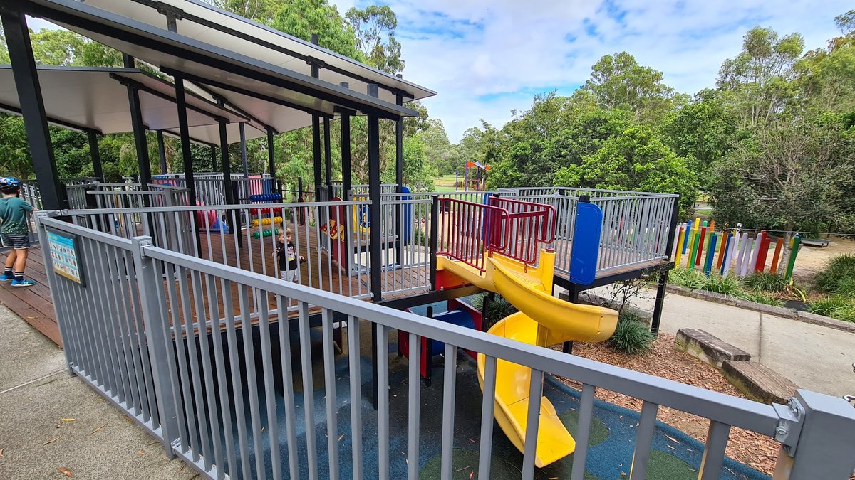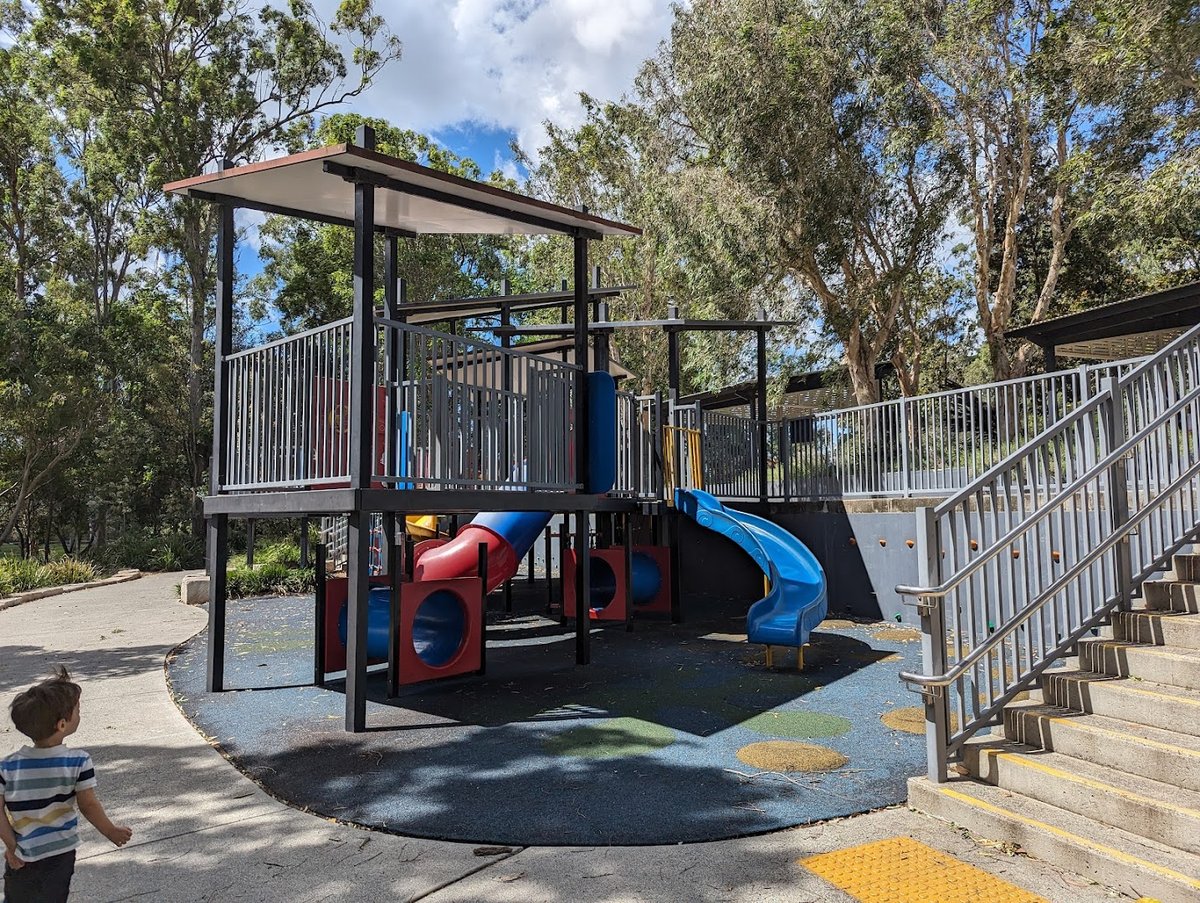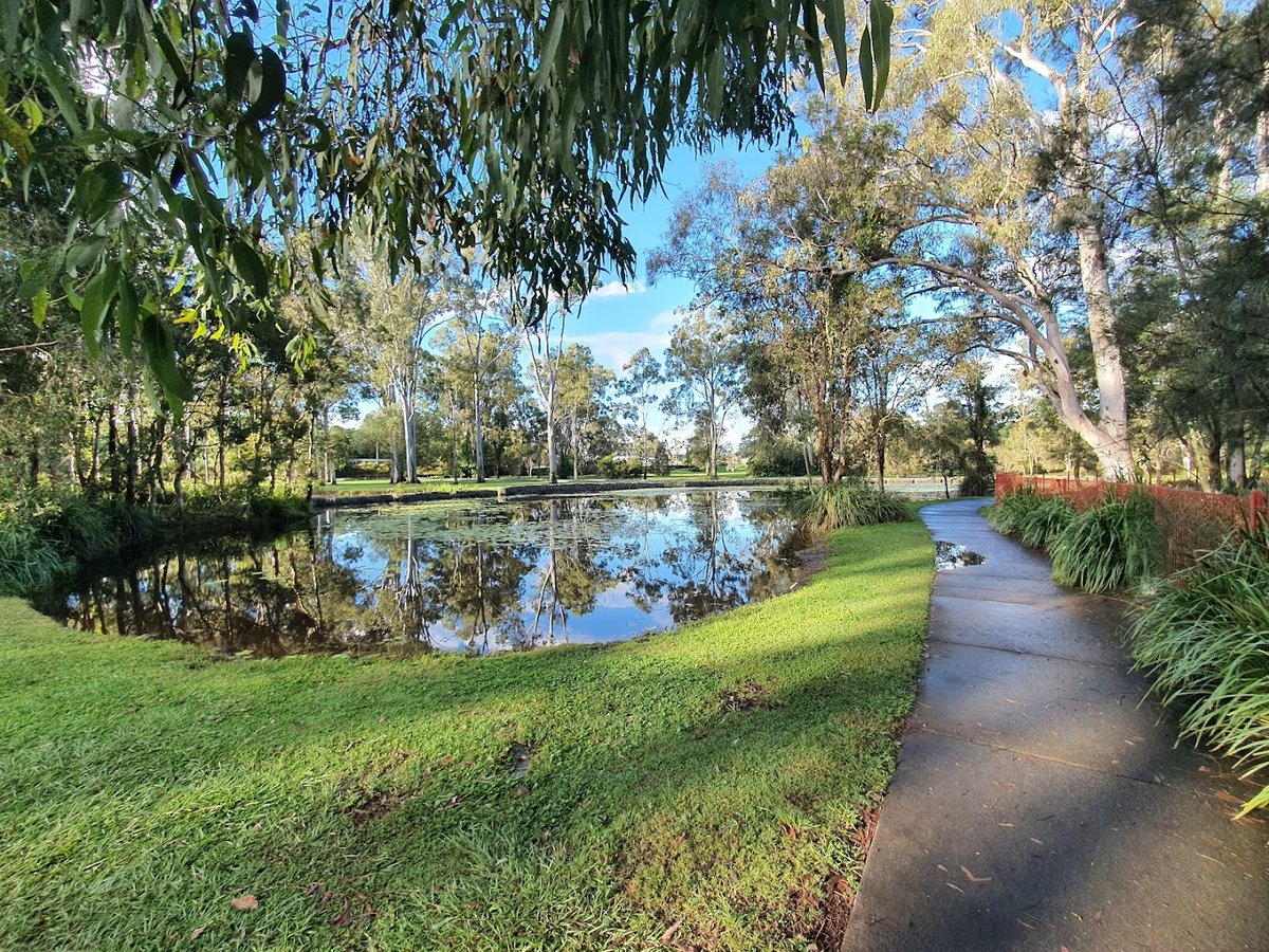 Capalaba Regional Park Dog Park offers a spacious and well-equipped environment for both pets and families. The dog-specific area is fully enclosed with secure chain-link fencing, providing a safe off-leash space for dogs to run and socialize. The ground surface within the dog park is primarily natural grass, though some areas near high-traffic zones like the water station feature concrete pads to prevent mud. Mature eucalyptus trees are scattered throughout the park, offering ample natural shade for both dogs and their owners. For convenience, the area includes essential amenities such as a dedicated dog water fountain, benches for seating, and trash cans for waste disposal. Beyond the dog-specific enclosure, the wider regional park features a large, modern playground with multiple slides and climbing structures, scenic walking paths that wind around a picturesque lily pond, and educational signage regarding local wildlife. The atmosphere is serene and community-oriented, characterized by lush greenery and well-maintained facilities that cater to a variety of outdoor activities.