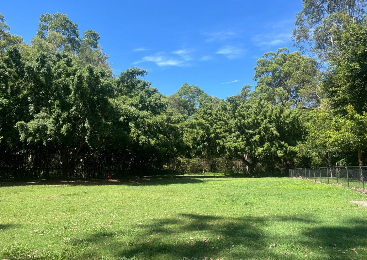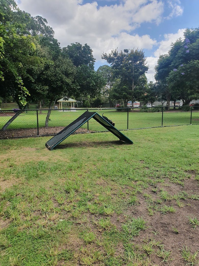 Large flat off leash dog park with a shelter shed. Fully fenced and shady.