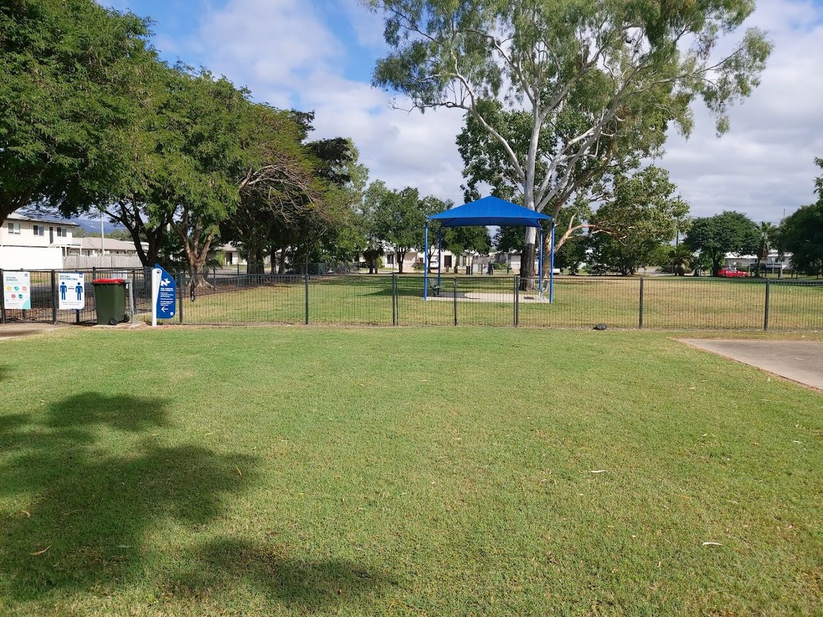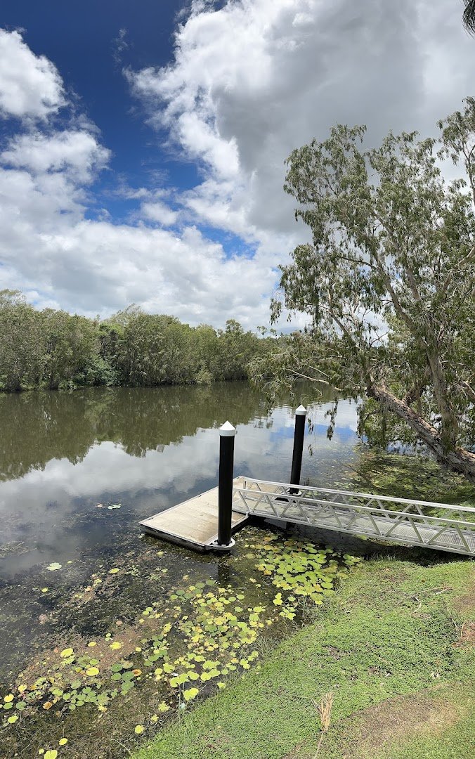 Jabiru Park Dog Park is a spacious and well-equipped off-leash area situated in a scenic location next to a waterway. The park is fully enclosed by secure metal fencing, providing a safe environment for dogs to run. The terrain is primarily flat and covered in grass, with some dirt patches in high-use areas. A key feature of the park is the inclusion of agility equipment, such as A-frame ramps and tunnels, which offer physical and mental stimulation for pets. For human visitors, the park offers several benches and a blue shade sail structure for relief from the sun, complemented by the natural canopy of numerous mature trees. A paved path runs through the park, enhancing accessibility. Practical facilities include a trash bin located near the gated entry. The adjacent river, complete with a small jetty and lily pads, adds to the park's tranquil and picturesque atmosphere, making it a pleasant destination for dog owners.