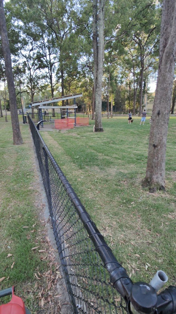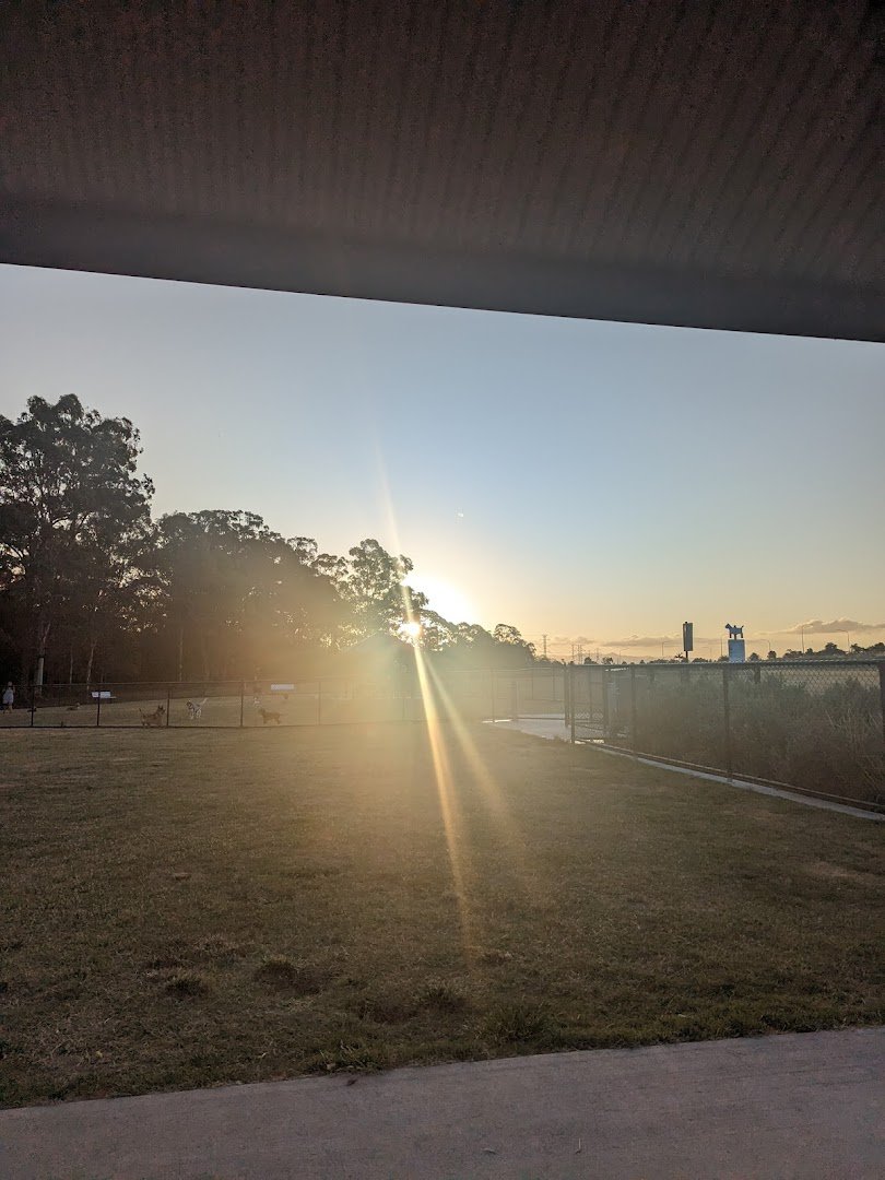 The Daytime Hidden World Dog Off-Leash Area is a spacious and well-maintained park located in Australia, offering a variety of amenities for both dogs and their owners. The park features expansive, lush green grassy fields that provide ample room for dogs to run and play freely. It is fully enclosed with secure black chain-link fencing, including gated entry points to ensure safety. The area is characterized by a mix of open sunny spaces and significant natural shade provided by numerous mature eucalyptus and other native trees. For human visitors, the park includes several benches scattered throughout the fenced area and sheltered pavilions for protection from the elements. A notable feature is the large, multi-level wooden playground structure with a red spiral slide, making it a family-friendly destination. Practical facilities such as water fountains for hydration are visible near the entrances. The overall atmosphere is peaceful and natural, with a sense of community as dogs and owners enjoy the large, open environment. The park appears to be well-integrated into a larger recreational area, combining dedicated dog spaces with general park facilities.