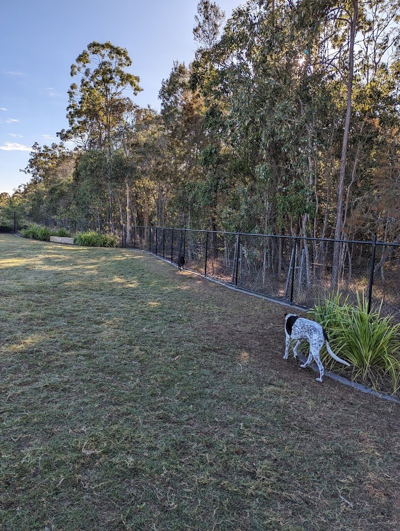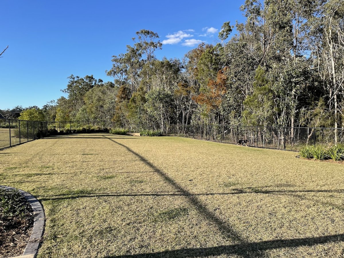 Big Paws Dog Park offers a sprawling and secure environment for dogs to exercise and socialize. The park is fully enclosed by a sturdy black chain-link fence, ensuring a safe off-leash experience. The terrain is primarily covered in grass, though some areas under the dense canopy of tall trees feature a mix of dirt and leaf litter. These numerous mature trees provide extensive natural shade, making it a comfortable spot even during warmer Australian days. Facilities include basic agility equipment like a wooden ramp to challenge more active pets. For human visitors, the park provides several seating options, ranging from traditional benches to large stone blocks strategically placed around the perimeter. The park's location appears to be on an elevated site, offering pleasant views of the surrounding wooded valleys. The overall atmosphere is peaceful and rustic, blending seamlessly with the natural bushland. While the images focus on the open play areas, the presence of well-maintained fencing and equipment indicates a dedicated and cared-for community space for local dog owners.