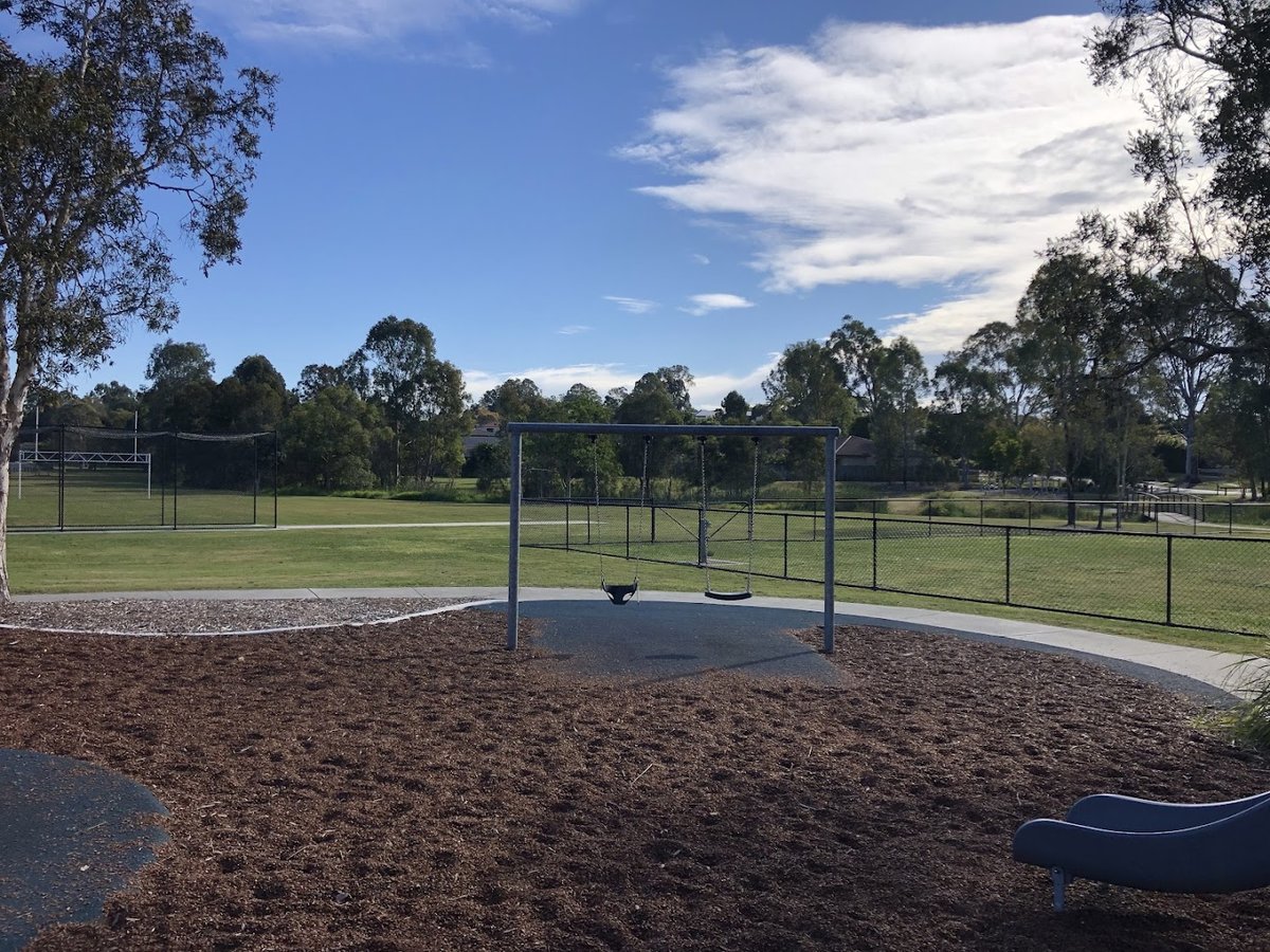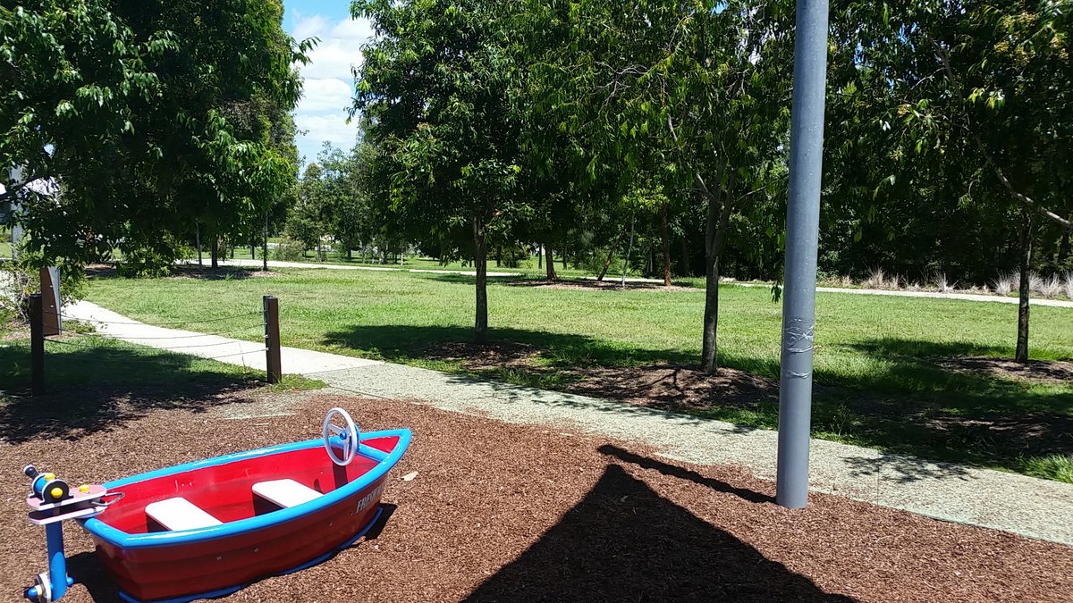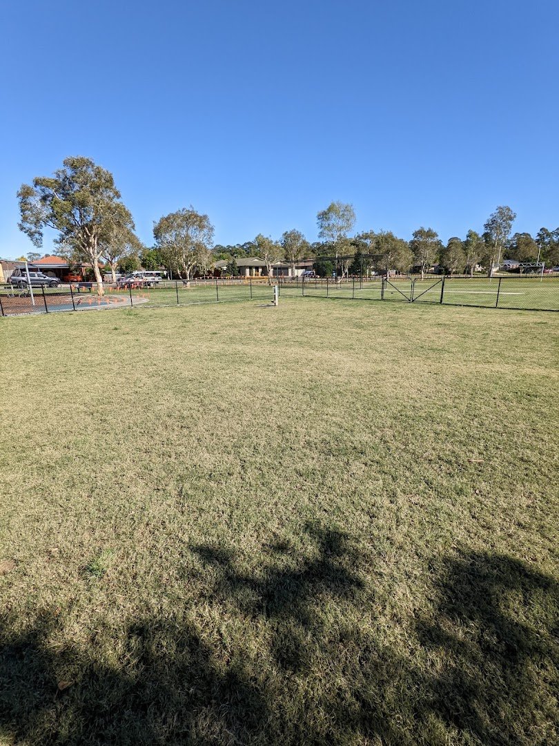 Ultramarine Parade Dog Park offers a spacious and well-maintained environment for both dogs and their owners. The primary feature is a large, fully fenced off-leash area enclosed by black chain-link fencing, accessible via a secure double-gate entry system. Inside the enclosure, the surface is predominantly flat grass, providing ample room for dogs to run. Amenities within the fenced area include multiple benches, a sheltered picnic table, and a dedicated water station with a dog bowl. While the park features a man-made shelter, several large mature trees also provide significant natural shade throughout the day. Outside the dog-specific zone, the broader park area includes a children's playground with swings, a slide, and a themed boat toy on woodchip surfaces, as well as sports facilities like cricket nets. Paved pathways connect the various sections, making the park accessible and family-friendly. The overall atmosphere is open and inviting, set within a suburban landscape. The park's layout effectively separates active play areas from quiet seating zones, ensuring a pleasant experience for all visitors.