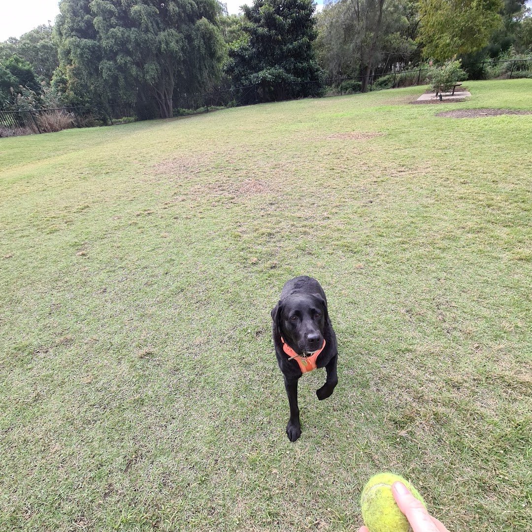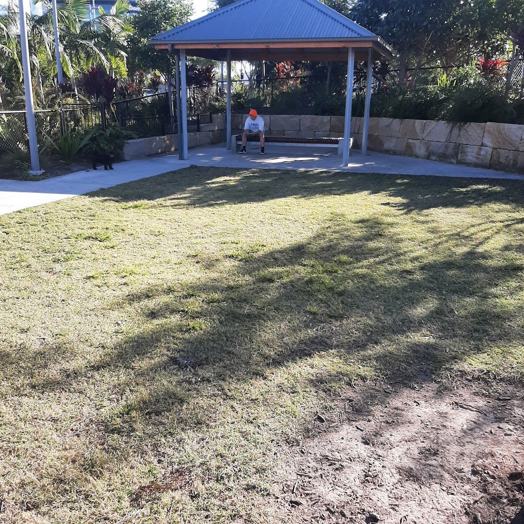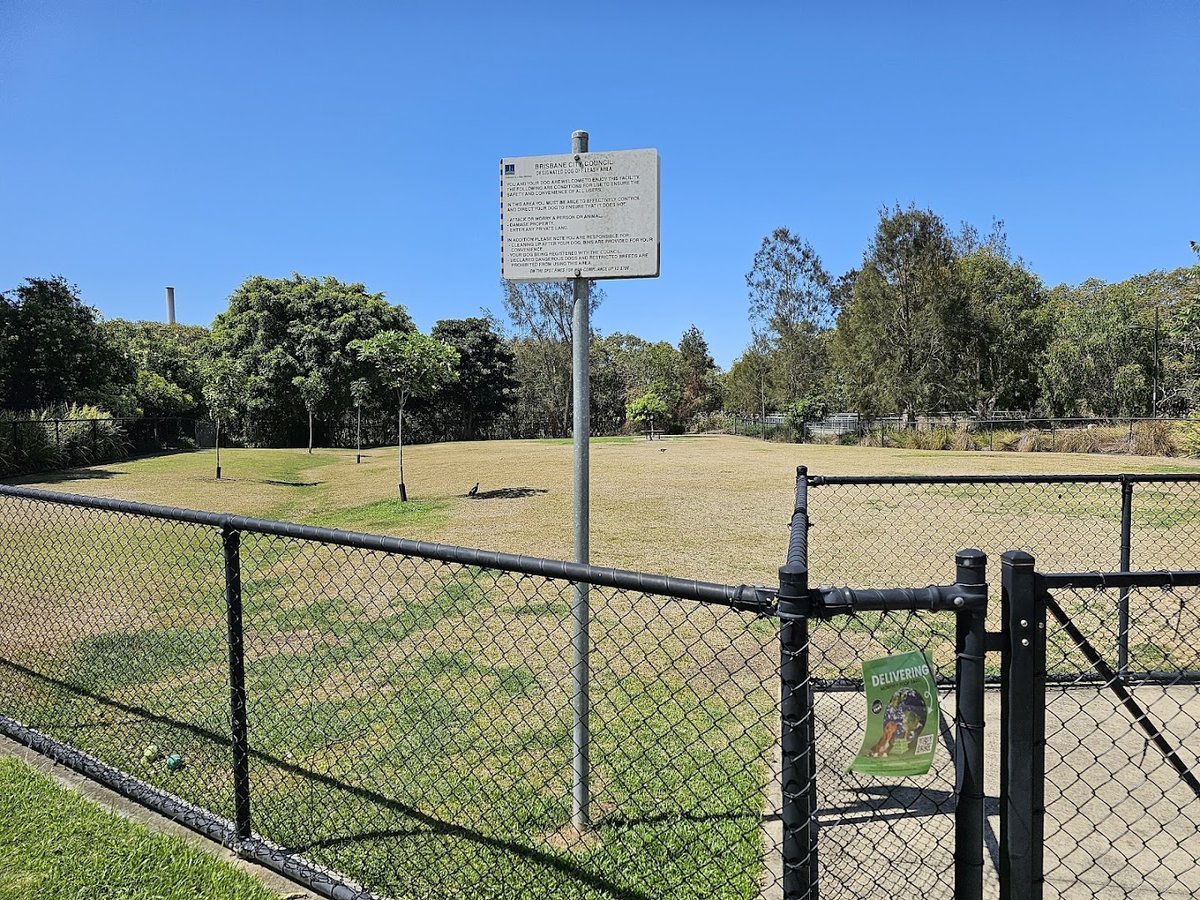 The Old Shoreline Park Dog Off-Leash Area in Brisbane provides a generous, fully fenced space for dogs to run and socialize. The park is characterized by its expansive, well-kept grass surface, which includes some gently sloping areas. Security is a priority, with high black chain-link fencing and gated entries visible across the site. For human visitors, the park is well-equipped with multiple sheltered structures containing benches and picnic tables, providing essential shade from the Australian sun. Mature trees also dot the landscape, offering additional natural cover. A dedicated water station with a ground-level bowl ensures dogs stay hydrated during play. The park's location offers a blend of urban convenience and open green space, with views of city buildings and proximity to local shops. While large light towers are present in the vicinity, likely serving adjacent sports fields, they contribute to the overall visibility of the area. The park lacks specific agility equipment but makes up for it with its sheer size and functional amenities.