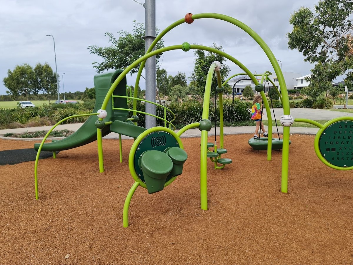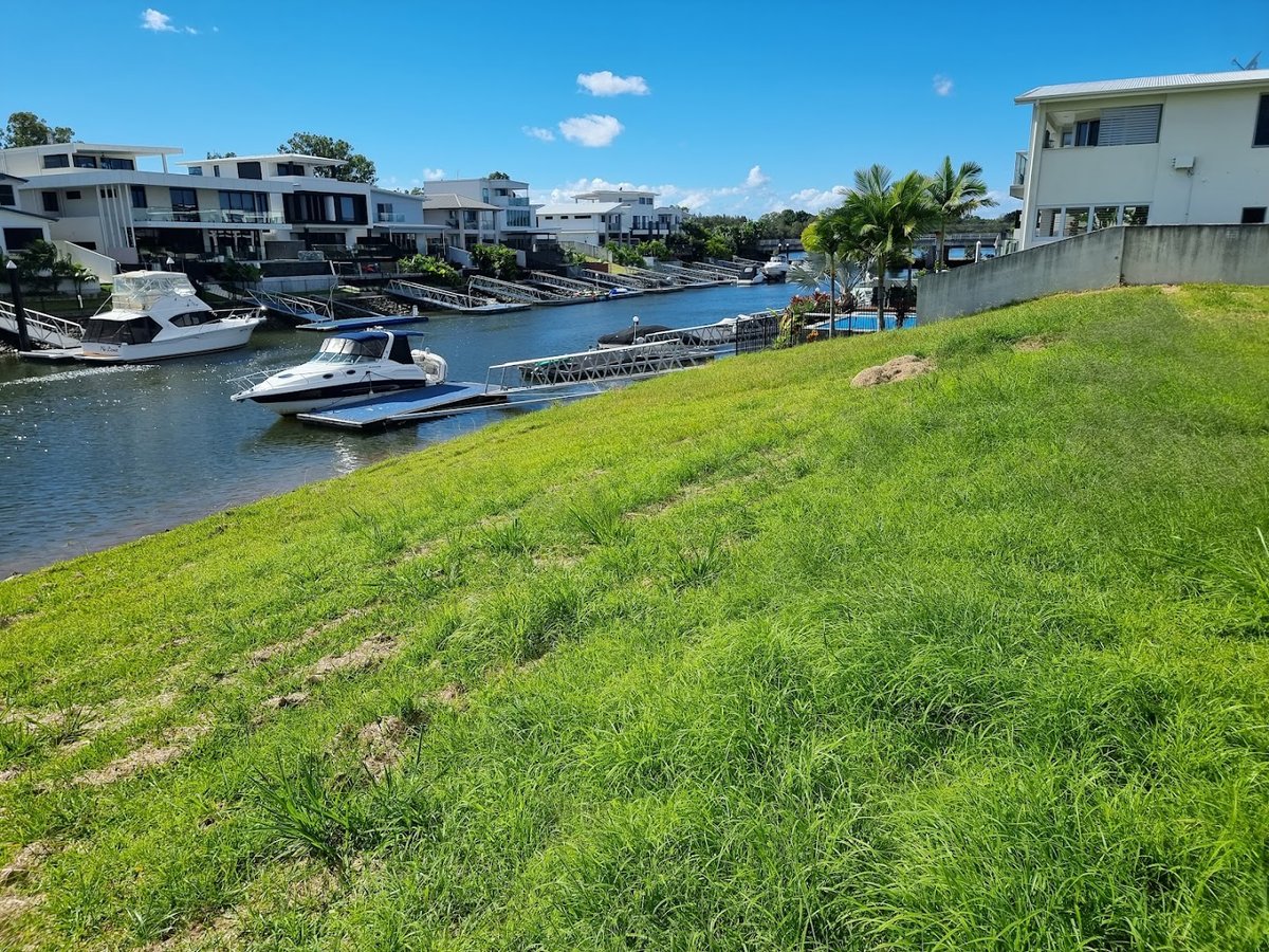 Mangrove Jack Park in Australia provides a diverse outdoor space catering to both dogs and families. The park features a significant off-leash area characterized by a large, open grassy field. Despite the 'No Fence' mention in the name, visual evidence shows a perimeter fence consisting of wooden posts and wire mesh, which helps contain pets during play. The ground surface is predominantly natural grass, ranging from short-mown sections to more natural, tall-grass areas. Mature trees around the field provide ample natural shade, contributing to a relaxed and scenic atmosphere. The park's location is particularly notable for its proximity to water, with views of a calm lake and a canal lined with residential docks and boats. For children, there is a modern playground equipped with contemporary climbing structures and a slide, situated on a safe woodchip base. Facilities include a trash can for convenience, though specific dog-waste bag dispensers are not clearly visible. The overall environment is a blend of functional exercise space and natural beauty, making it a popular spot for local residents to enjoy the waterfront setting.