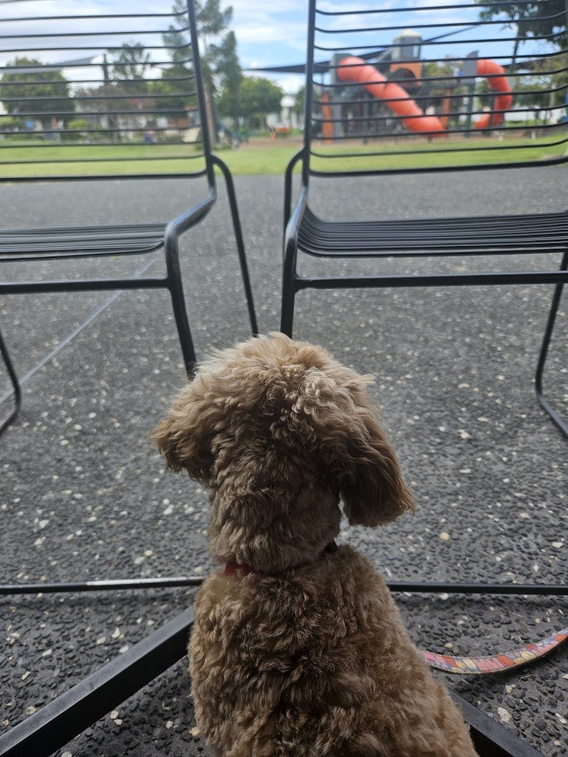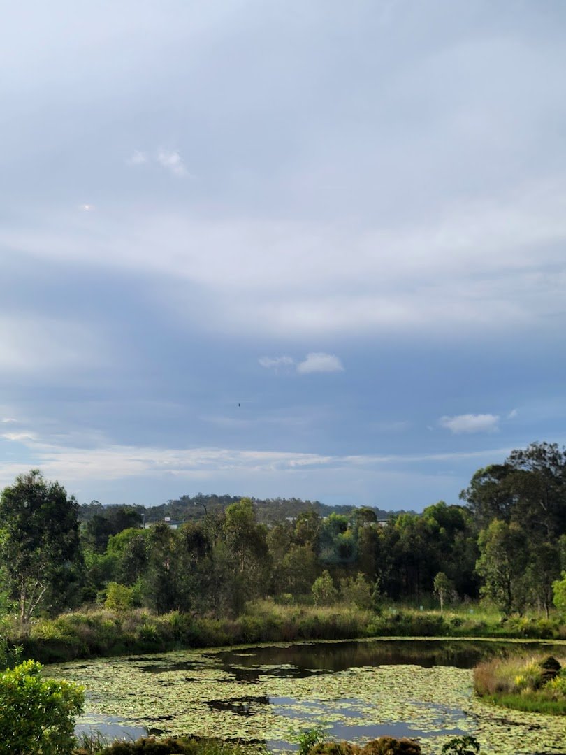 Salix Reserve East is a spacious and scenic park located in Australia, offering a variety of environments for dogs and their owners. The park is characterized by its expansive, well-maintained grassy fields that provide ample room for dogs to run and play. One of its standout features is the direct access to a large body of water, where dogs can be seen swimming. The landscape is dotted with mature trees that offer plenty of natural shade, and there are also wetland areas with lily pads and reeds. For human visitors, the park includes a playground with a large orange slide, paved paths for walking or cycling, and benches for resting. Practical amenities such as trash cans and a water tap are available on-site. While some fencing is visible around specific areas like the playground or water's edge, the main grassy expanses appear open and integrated with the natural surroundings, creating a relaxed and versatile outdoor space.
