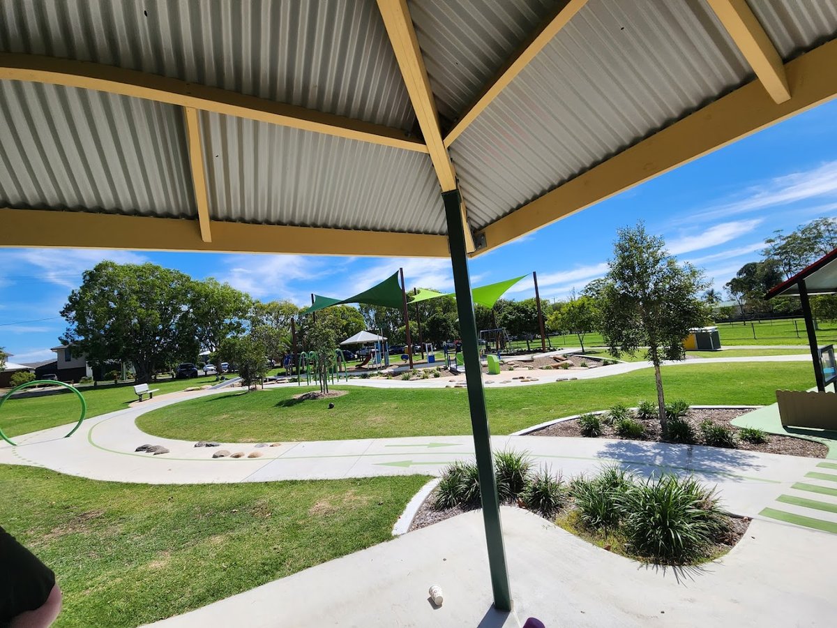 Paul Conti Park Off Leash Dog Area offers a spacious and well-maintained environment for dogs to exercise and socialize in an urban setting. The park features a large, fully fenced off-leash section, primarily surfaced with grass, though some high-traffic areas near trees and benches show exposed dirt. Mature trees provide ample natural shade within the dog enclosure, and a dedicated water station with a dog-level bowl ensures pets stay hydrated. For owners, several benches are scattered throughout the area, and a trash can is conveniently located for waste disposal. Adjacent to the dog area, the wider park includes a modern playground with shade sails, a paved walking path, and a sheltered gazebo, making it a family-friendly destination. The presence of a tall light pole suggests the area may be usable during early evening hours. Situated near urban developments, the park provides a significant green space with a relaxed atmosphere. The perimeter is secured by a sturdy black chain-link fence, ensuring a safe environment for dogs to run freely across the expansive flat terrain.