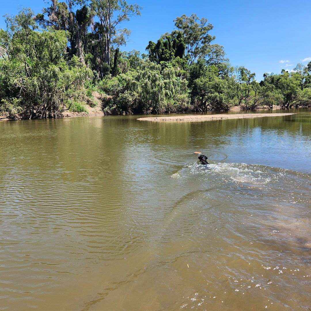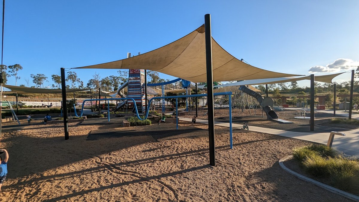 Aussie Bush Jimboomba Sniffspace offers a comprehensive outdoor experience for dogs and their owners in a tranquil Australian bushland setting. The park features multiple expansive, securely fenced off-leash areas constructed with black chain-link fencing, providing ample room for dogs to run and socialize. The primary ground surface is well-maintained grass, which is ideal for active play, while paved concrete paths provide easy access between different sections. For canine enrichment, the facility is equipped with various agility structures, including a custom wooden climbing platform with ramps and a dedicated 'Social Sniff Stick' for scent marking. Owners can find comfort on provided benches or at the sheltered picnic tables located nearby. Essential amenities like water stations and trash cans are conveniently placed within the fenced zones. While the dog areas benefit from natural shade provided by the surrounding mature eucalyptus trees, the adjacent public space features a massive children's playground protected by large shade sails. Additionally, the proximity to a natural waterway allows for supervised swimming opportunities, making it a versatile destination for high-energy pets.