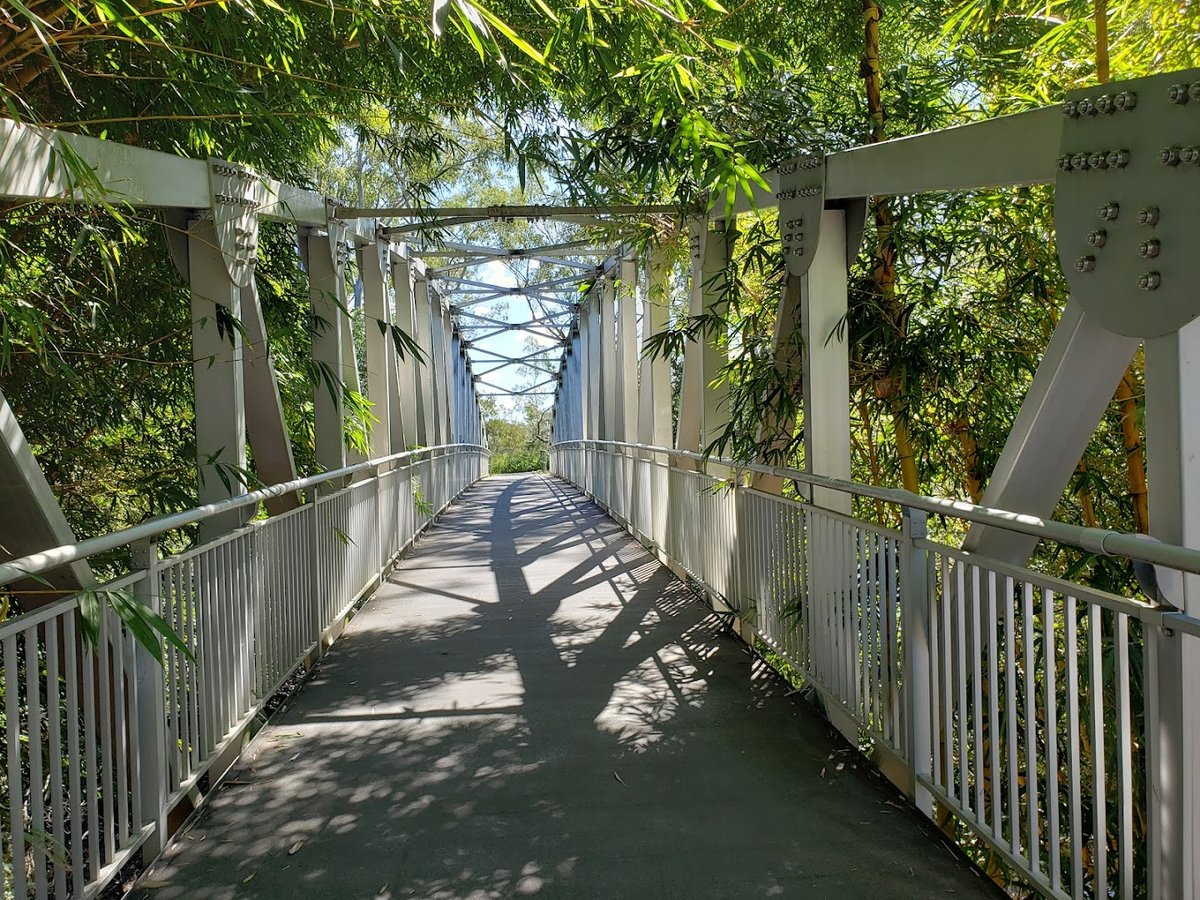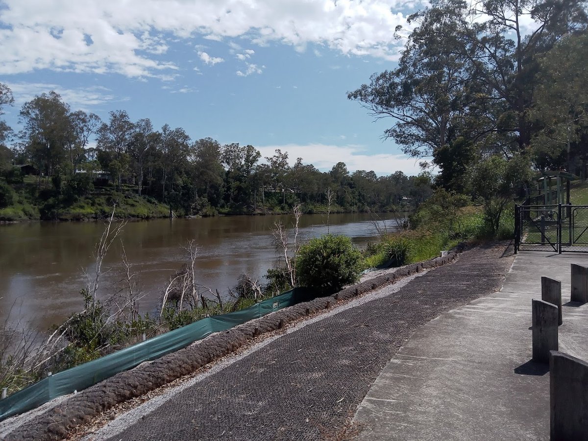 Jindalee Dog Park, situated along the scenic banks of the Brisbane River, provides a well-equipped environment for canine exercise and socialization. The park features a secure, fenced off-leash area characterized by a combination of grassy and natural earth surfaces. Within the enclosure, dogs can enjoy basic agility equipment, such as an A-frame, while owners have access to benches for resting. A dedicated water station with a low-level bowl ensures pets stay hydrated. The park is notable for its significant natural shade, provided by large, established trees, including a particularly impressive fig tree with an expansive root system. Beyond the fenced area, the wider parkland offers vast open grassy fields suitable for various activities, as well as paved walking tracks that follow the river's edge. A pedestrian bridge connects different sections of the park, surrounded by lush vegetation like bamboo. The overall atmosphere is peaceful and well-integrated into the natural riverside landscape, making it a popular spot for local residents. The use of sturdy chain-link fencing throughout the designated dog zones provides a safe and contained space for off-leash play.