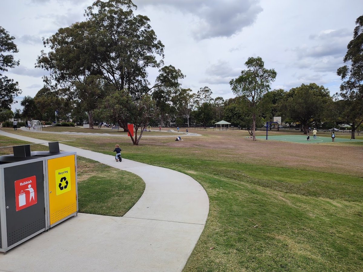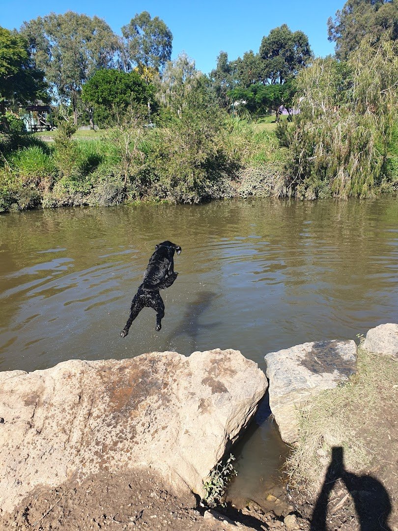 Bradbury Park Dog Off-Leash Area in Australia is a multifaceted community space that caters to both pets and their owners. The park features a large, securely fenced grassy enclosure specifically for dogs, providing ample room for exercise and socialization. Within this area, a sheltered gazebo with a picnic table offers a comfortable spot for owners to rest under the shade of mature eucalyptus trees. A standout feature of the park is the adjacent natural creek, where dogs are often seen swimming and jumping from the rocky banks into the water, offering a refreshing play option. The broader park environment is well-maintained, featuring paved walking paths, a dedicated scooter track, and a basketball court. For families, the park includes a striking, modern wooden playground structure known for its imaginative design. Practical amenities are well-integrated, including high-visibility rubbish and recycling stations, water fountains, and various seating options. The atmosphere is vibrant and active, set against a backdrop of lush greenery and open skies. The terrain is primarily flat with gentle undulations, covered in healthy grass, making it an ideal spot for outdoor recreation.