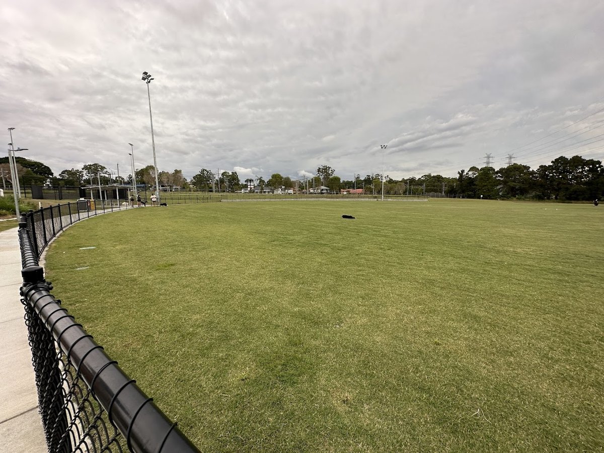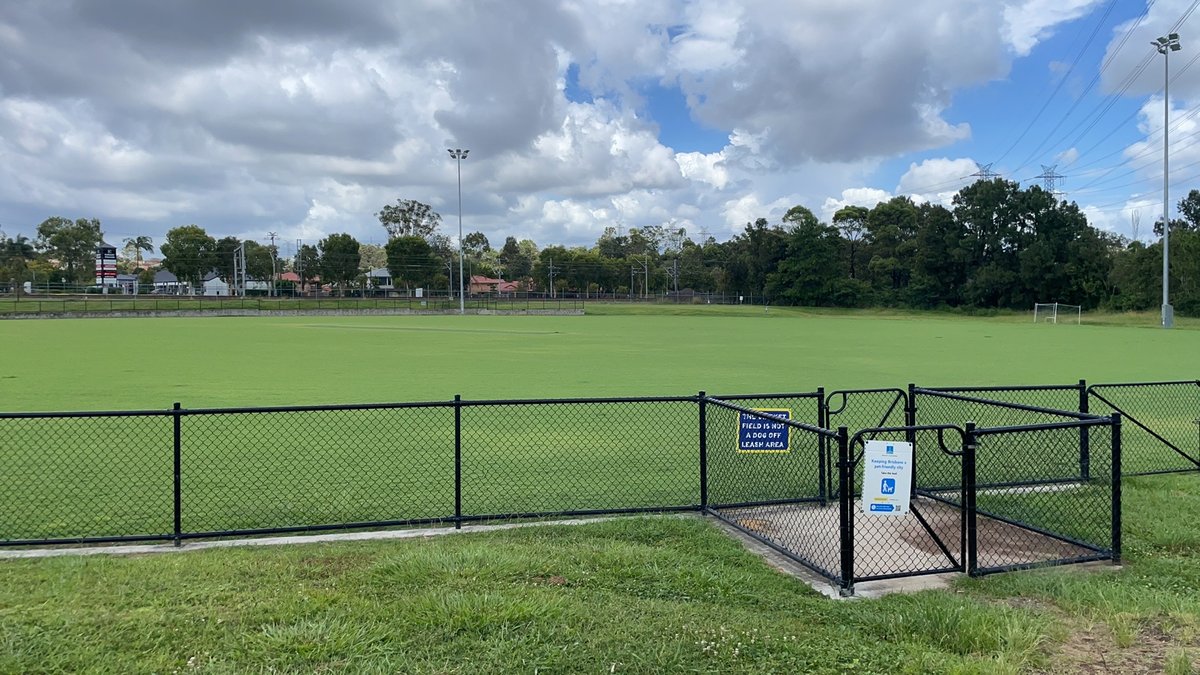 Wally Tate Dog Park in Australia offers a variety of spaces for canine exercise, most notably a dedicated fenced-off area for large dogs. The park features expansive, well-maintained grassy fields, though some are designated as on-leash only. The off-leash sections are secured with sturdy black chain-link fencing and include double-gated entries for safety. Mature trees throughout the park provide significant natural shade, particularly in the wooded areas where paved walking paths are located. The ground surface is primarily grass, with some dirt patches in high-traffic or shaded spots. Essential amenities like trash cans are provided within the fenced zones. Large floodlights are installed around the main fields, indicating the park is equipped for use during low-light hours. The overall atmosphere is one of a spacious, multi-use community park that balances sports facilities with dedicated, secure spaces for dogs to run freely. The park's layout encourages both active play in open spaces and quieter walks along the shaded perimeter paths.