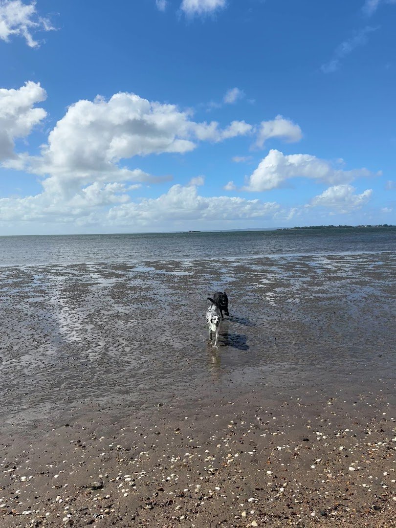 Lota Dog Park in Australia is a versatile and expansive recreational area that offers a variety of environments for dogs and their owners. The park features a large, securely fenced off-leash area with a primary surface of grass, though some dirt patches and natural undulations are present. The fencing is a high-quality black chain-link design that ensures safety while maintaining visibility. One of the standout features is the park's proximity to the water, with dogs shown enjoying the muddy flats and shoreline at low tide, suggesting direct beach access. For human visitors, the facility is well-equipped with multiple benches, a large covered picnic shelter, and a dedicated playground area protected by green shade sails. A paved path with directional markings indicates a space for children's activities like scootering. Mature trees are scattered throughout, providing natural shade alongside the man-made structures. The presence of a solar-powered light pole suggests the park is designed for use during extended hours. The overall atmosphere is open, community-oriented, and highly functional for active pets.