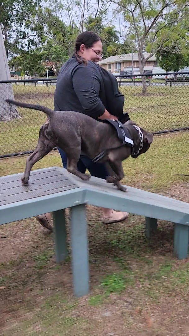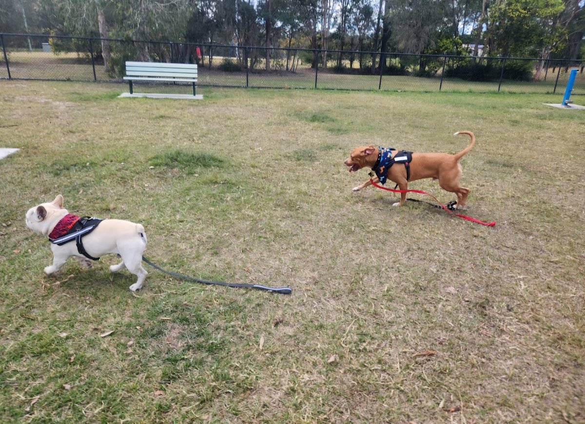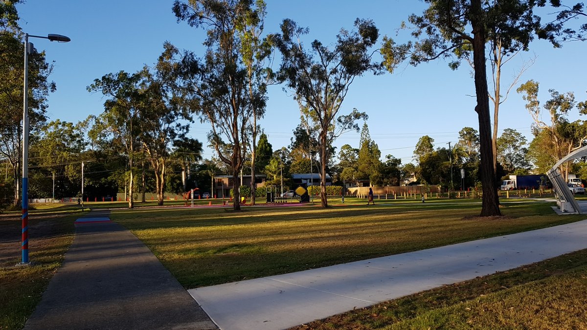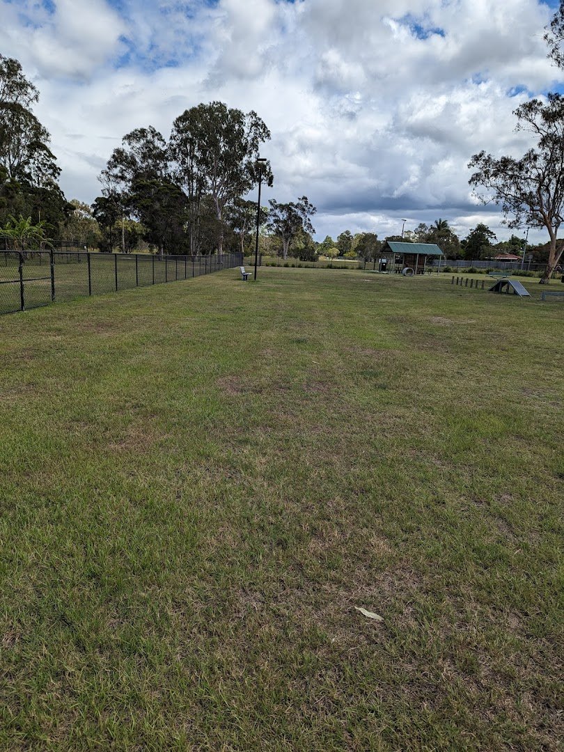 Brandon Park off-leash dog park in Australia offers a comprehensive and secure environment for canine exercise and socialization. The facility is characterized by its expansive, well-manicured grassy fields, providing ample space for dogs of all sizes to run freely. The park is fully enclosed by sturdy black chain-link fencing and utilizes a double-gate entry system to ensure the safety of all visitors. For enrichment, the park includes various agility equipment such as ramps and weave poles, encouraging active play. Human visitors can take advantage of several amenities, including multiple benches strategically placed along the perimeter and a sheltered area featuring a picnic table. Mature eucalyptus and other native trees are scattered throughout, offering patches of natural shade, while a dedicated water station ensures dogs stay hydrated. The park is also equipped with lighting for extended use during early mornings or evenings. Paved walking paths border the dog-specific zones, making the area accessible. The overall atmosphere is peaceful and community-oriented, set within a larger parkland context that includes open green spaces and mature vegetation.