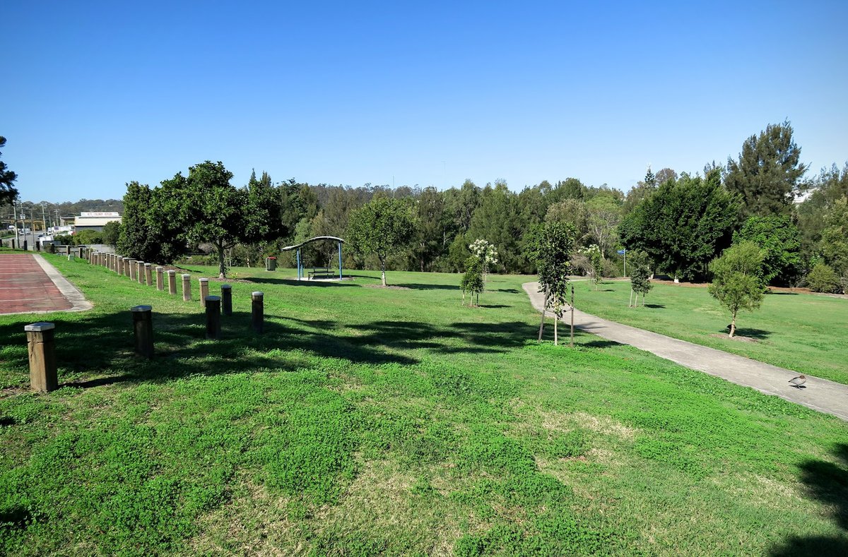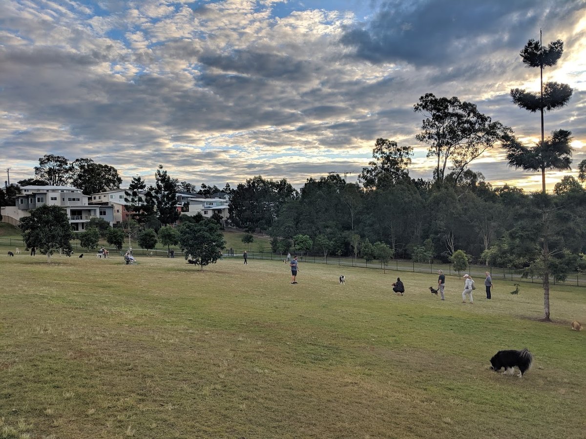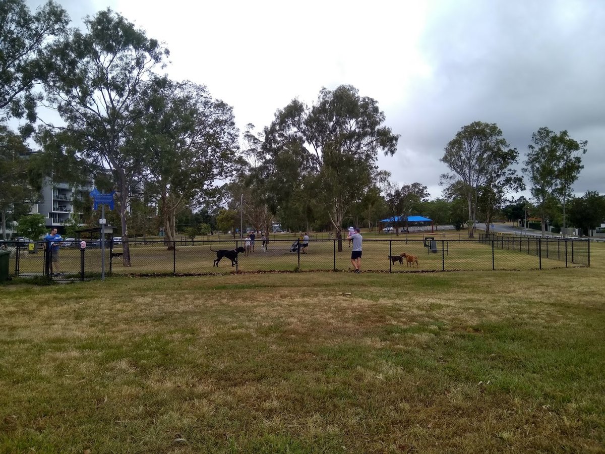 New Farm Dog Park, situated within the iconic New Farm Park in Brisbane, offers a spacious and well-equipped environment for dogs to socialize off-leash. The facility is divided into fenced sections, providing separate areas for different dog sizes. The terrain is a combination of open grassy fields and high-traffic dirt areas, particularly beneath the expansive canopies of mature trees that offer significant natural shade. For convenience, the park is outfitted with multiple water fountains featuring integrated dog bowls, several benches placed on mulched or concrete pads, and waste disposal bins. Tall lighting poles are distributed across the site, ensuring visibility for late-afternoon or evening exercise. The park's perimeter is secured by sturdy black chain-link fencing, often bordered by concrete pathways. While the dog park itself is focused on canine activity, its location within the larger public park provides visitors with access to scenic river views, picnic spots, and a vibrant community atmosphere. It is a highly frequented urban oasis that balances functional pet facilities with the natural beauty of its riverside setting.