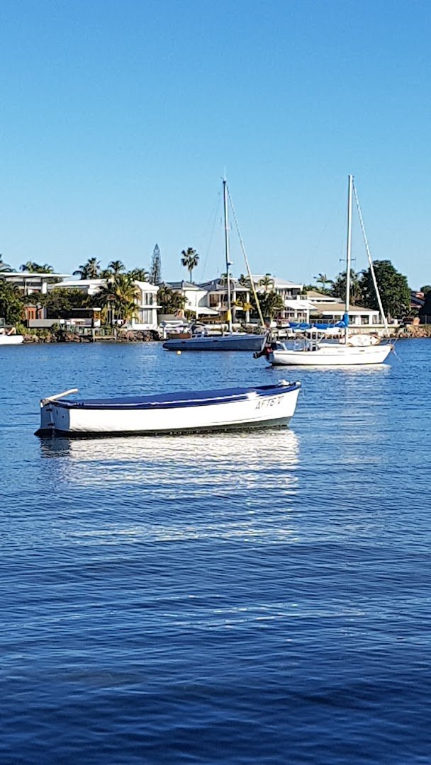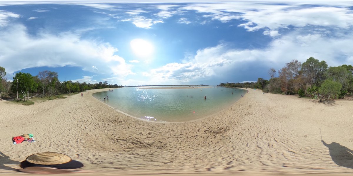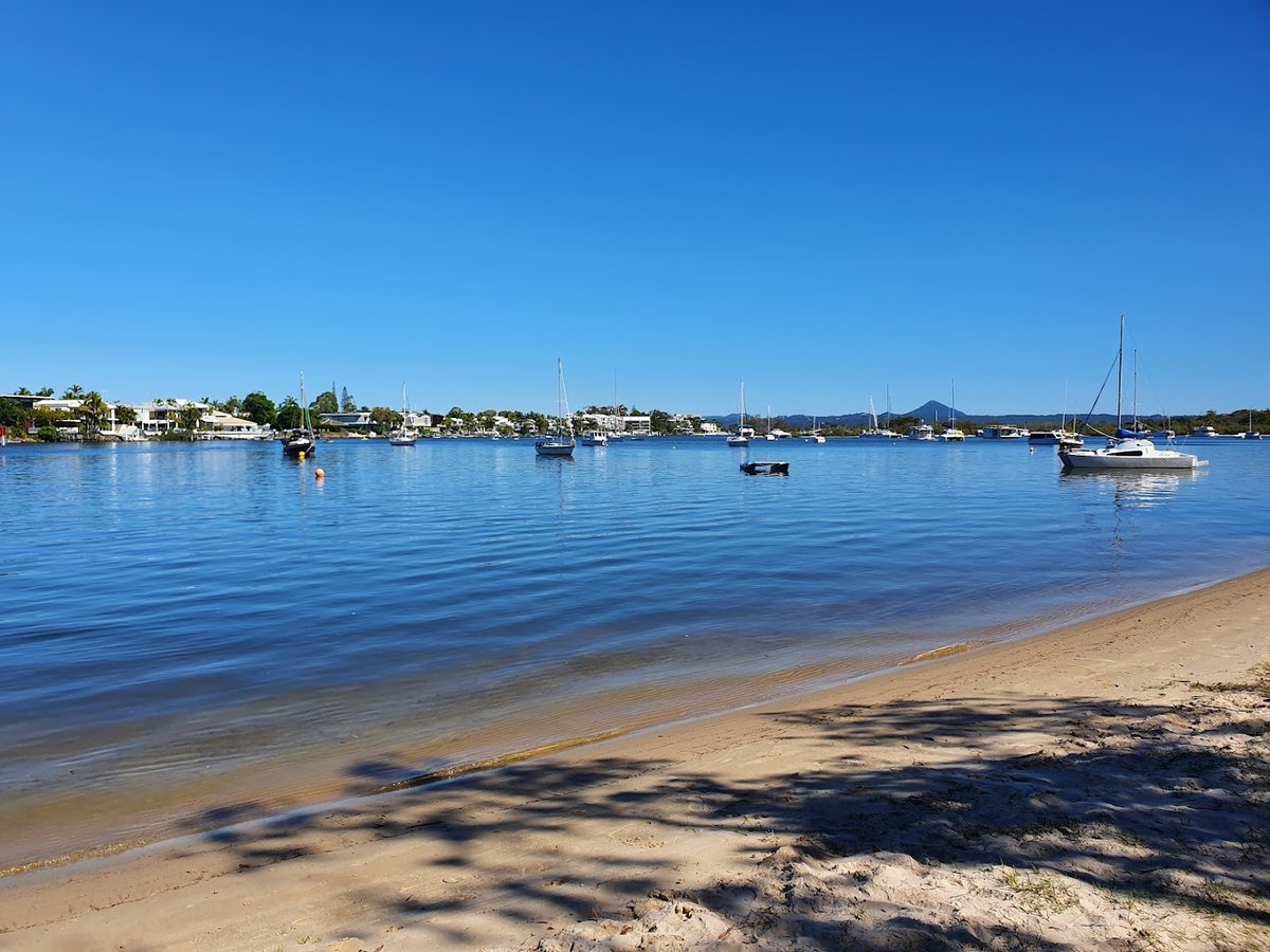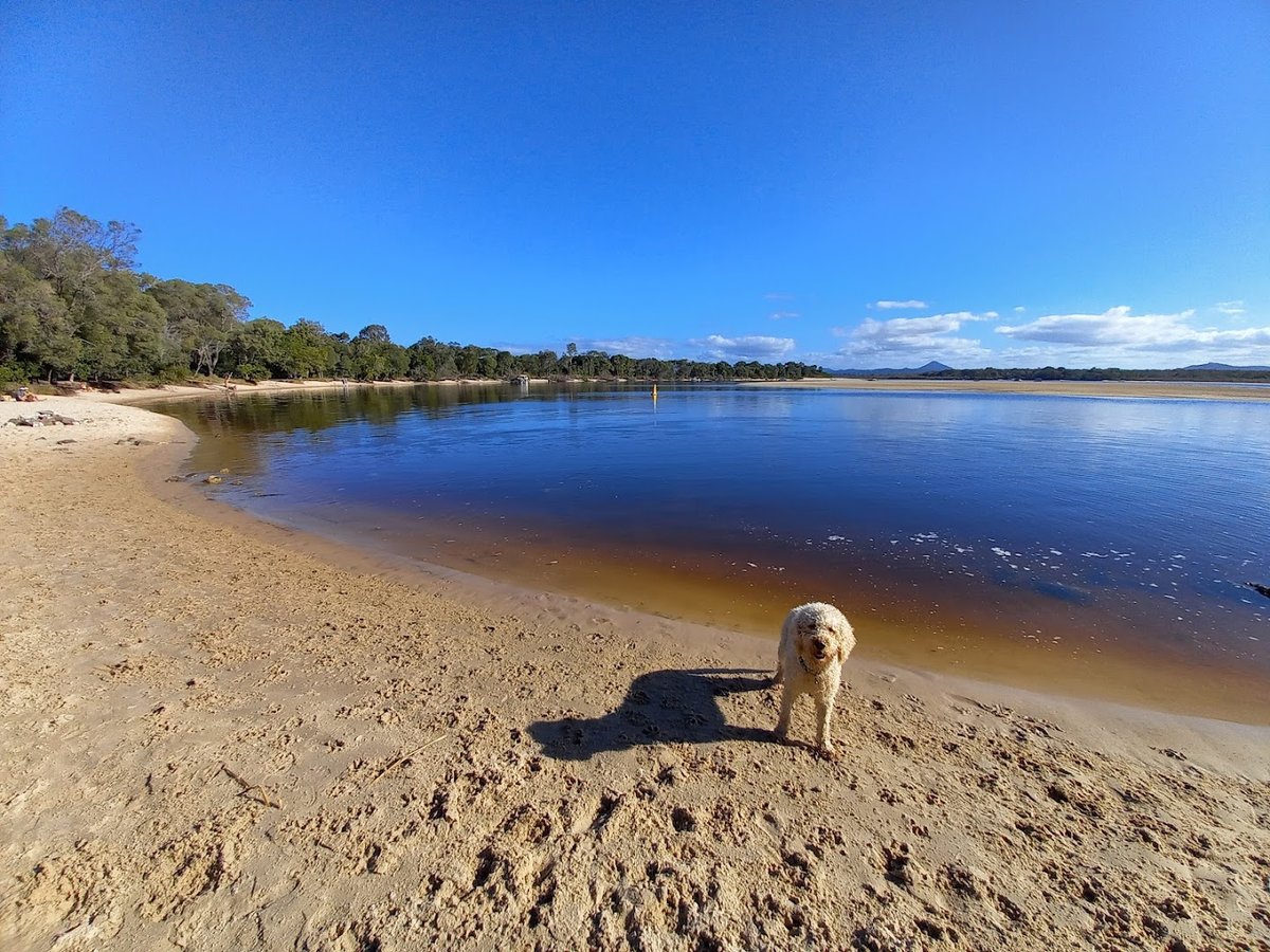 Doggy Beach in Australia is a sprawling and picturesque off-leash destination that offers a variety of environments for dogs and their owners. The primary attraction is the extensive sandy beach area situated along a calm river estuary that leads out to the ocean. These shallow, gentle waters are ideal for dogs of all sizes to swim, splash, and even try their paw at surfing. The beach itself provides a vast, open space for running and social interaction. In addition to the open beach, the park includes a dedicated fenced-in area featuring a mix of grass and dirt surfaces, providing a secure space for dogs that require more containment. Natural shade is plentiful, provided by the lush trees and coastal vegetation that line the shore and the perimeter of the fenced section. The overall atmosphere is vibrant yet relaxed, with a clear community feel as people and pets enjoy the scenic waterfront together. While specific man-made facilities like benches or restrooms aren't prominently featured in these views, the combination of natural beauty and functional dog-friendly spaces makes it a premier location for outdoor recreation.