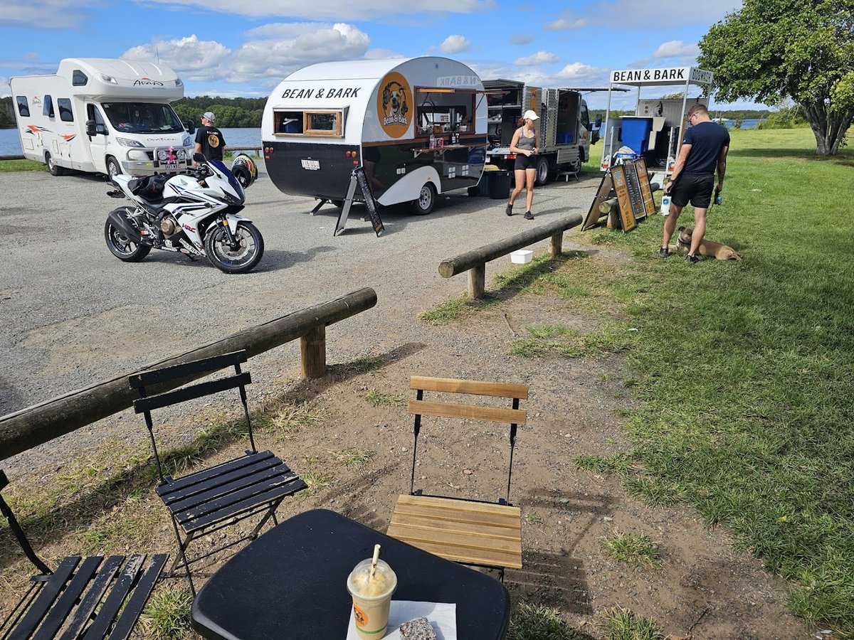 Tuckeroo Park Dog Off-Leash Area is a versatile and spacious facility located in Australia, offering a variety of environments for dogs and their owners. The park features a large, securely fenced off-leash section characterized by a mix of grass and dirt surfaces, heavily shaded by mature eucalyptus trees. This area includes a double-gate entry system for safety and visible waste disposal bins. Beyond the fenced enclosure, the park provides access to a scenic sandy beach area along the water, allowing dogs to swim and play in the shallows. The facility is well-equipped with amenities, including a gravel parking area that often hosts mobile services like the 'Bean & Bark' coffee and dog wash trailers. Visitors can find basic seating such as folding chairs and tables near the food trucks, creating a social hub. The overall atmosphere is relaxed and community-oriented, catering to both active play in the large open spaces and social interaction in the amenity zones. The combination of shaded woodland, open grass, and beach access makes it a comprehensive destination for pet owners.
