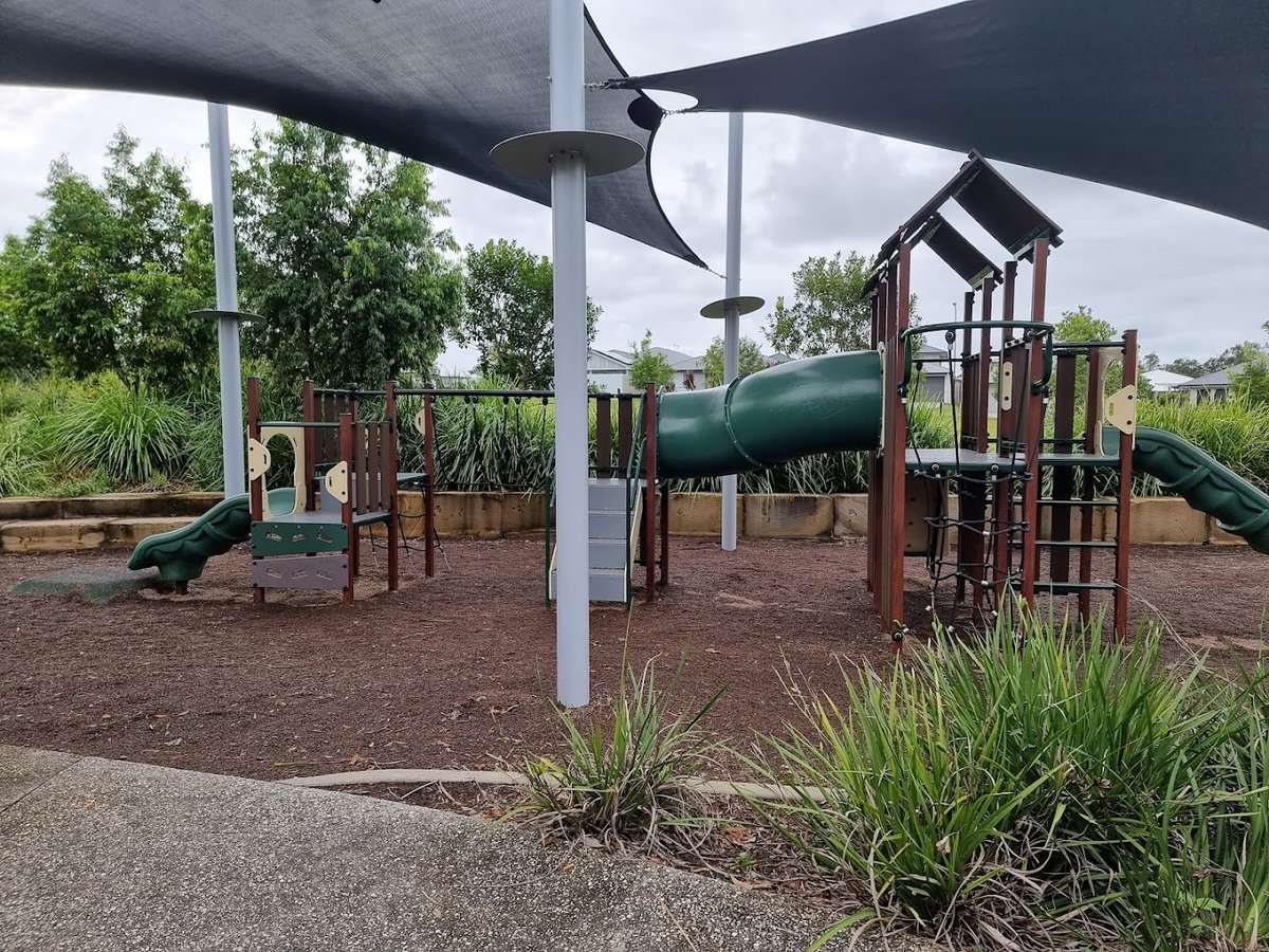 Baldwin dog park is a spacious community facility featuring a large, fenced-off area specifically for dogs to exercise off-leash. The dog-specific zone is primarily covered in natural grass and includes agility equipment such as an A-frame ramp to keep pets engaged. For owners, the park provides benches and sheltered picnic tables, offering a comfortable place to rest. The park is highly family-oriented, as it is situated next to multiple children's playgrounds that feature modern equipment like slides and climbing structures, with some areas protected by large shade sails. While the dog area is mostly open, scattered trees and man-made pavilions provide necessary shade. The perimeter is secured with chain-link fencing, ensuring a safe environment for dogs to run. The overall atmosphere is one of a well-maintained, multi-use suburban park that caters to both pet owners and families with children.