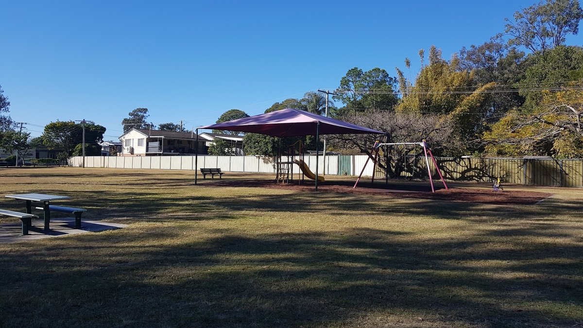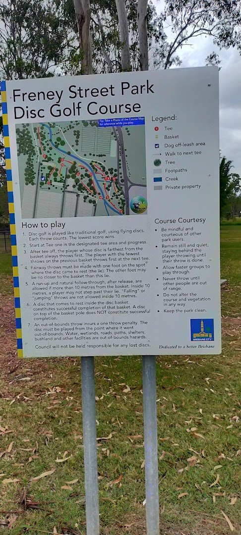 Kookaburra Park Dog Off Leash Area, situated within the larger Freney Street Park in Australia, provides a generous and secure environment for canine exercise and socialization. The primary feature is a large, fully enclosed off-leash zone secured by black chain-link fencing. The ground surface is primarily natural grass, which appears well-kept despite some high-traffic areas showing dirt. For the comfort of visitors, the park includes a substantial gazebo shelter with picnic tables inside the fenced area, along with several standalone benches positioned along the perimeter. A dedicated dog water station is available to keep pets hydrated. The park is characterized by its lush greenery, with numerous mature trees offering ample natural shade throughout the day. Beyond the dog-specific facilities, the surrounding parkland features a disc golf course and multiple modern playground areas equipped with protective shade sails, slides, and swings, making it a versatile destination for families. Practical amenities such as trash cans and a nearby parking area are visible, contributing to a convenient and welcoming atmosphere for the local community and their pets.