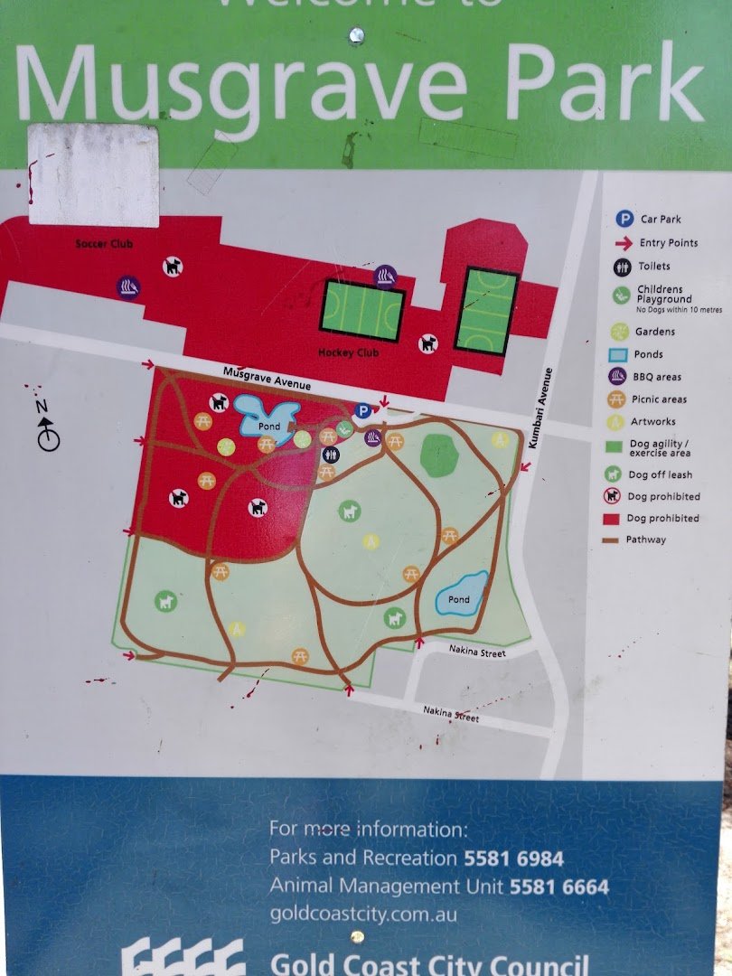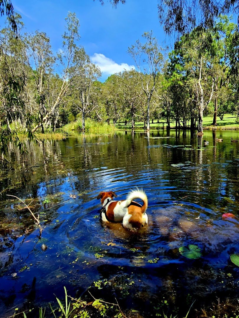 Musgrave Park Agility Dog Park in Australia offers a sprawling and versatile environment for dogs and their owners. The park features expansive grassy areas punctuated by numerous mature trees that provide ample natural shade, creating a comfortable atmosphere even on sunny days. A key highlight is the dedicated dog agility and exercise area, which includes equipment like hoops and frames for active training. The park is well-equipped with amenities, including multiple picnic tables, benches, and sheltered seating areas for relaxation. For convenience, the site includes paved walking paths, trash cans, and access to public toilets as indicated by the park map. A unique feature is the presence of natural ponds where dogs can be seen cooling off. While large portions of the park are designated as off-leash zones, there are also fenced sections to ensure safety. The overall terrain is mostly flat with lush grass, though some areas under trees have a more natural dirt surface. With its combination of open spaces, agility facilities, and family-friendly amenities like nearby playgrounds and BBQ areas, it serves as a comprehensive community hub for pet owners.