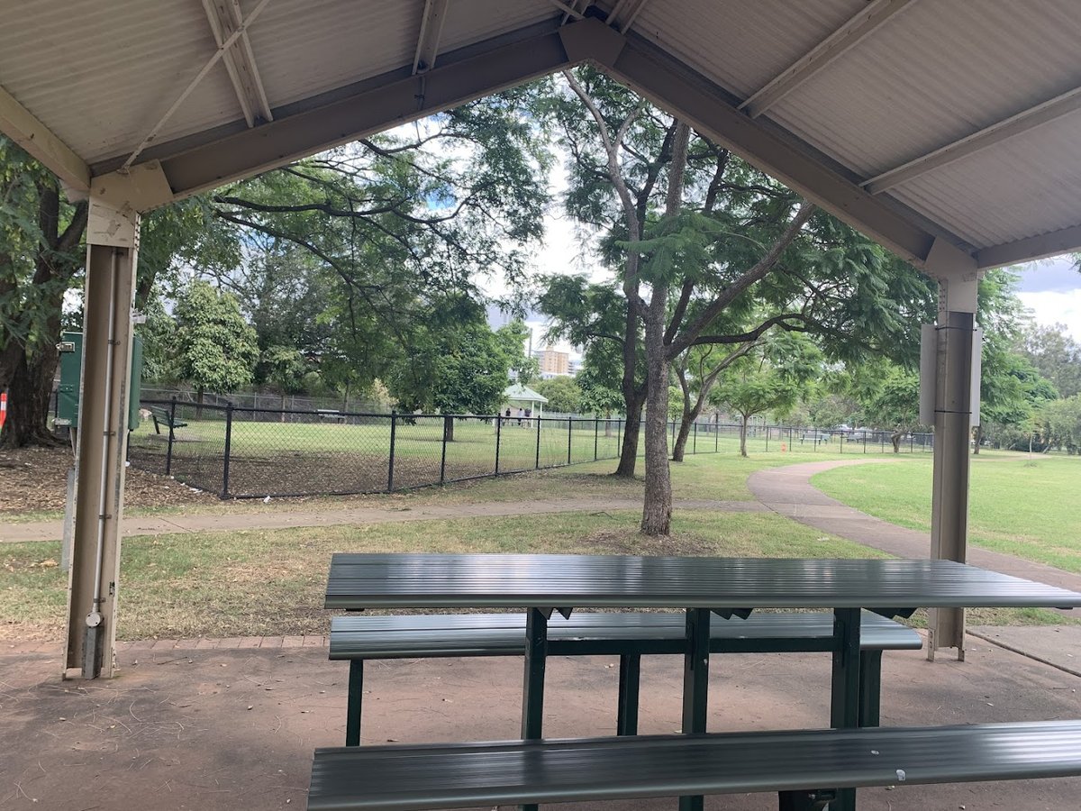 Victoria Park Barrambin Off-Leash Dog Park in Australia offers a sprawling and well-equipped environment for dogs of all sizes. The park features expansive, well-maintained grassy fields that provide ample room for high-energy activities like fetch, complemented by a large adjacent open space with soccer goals. For mental and physical stimulation, the facility includes agility equipment such as a rubberized A-frame and a concrete tunnel. The park is thoughtfully designed with several fenced enclosures using sturdy chain-link fencing and secure gated entries. Pet owners can enjoy numerous amenities, including a covered picnic pavilion with metal tables, multiple benches—one of which sits before a spectacular, ancient fig tree with an impressive root system—and accessible water fountains. Practical needs are met with conveniently located trash bins and waste bags tied to the fencing. The park boasts significant natural shade from mature trees, alongside artificial lighting for evening use. The atmosphere is a blend of urban convenience, with city skylines visible, and natural tranquility, making it a premier destination for local dog owners.