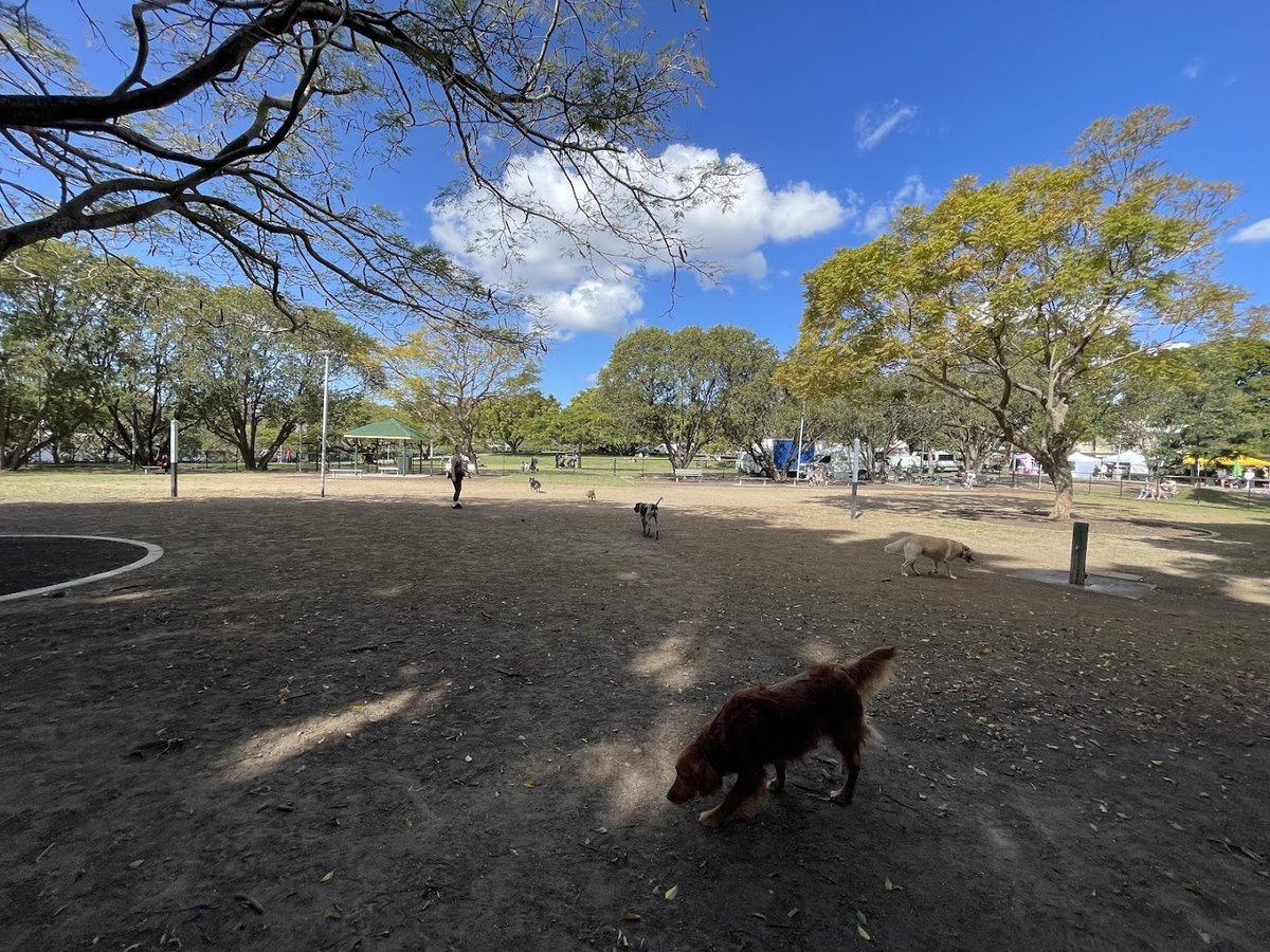 Carawa Street Park dog park in Australia offers a spacious and well-equipped environment for dogs and their owners to enjoy. The park features a variety of ground surfaces, including large areas of worn dirt in high-traffic zones and sections of lush, well-maintained green grass. The entire facility is fully enclosed by secure black metal fencing, which includes a double-gate entry system to prevent accidental escapes. Numerous mature trees are scattered throughout the park, providing significant natural shade for both pets and people, further complemented by a permanent green-roofed gazebo structure for additional shelter. Essential facilities are readily available, including a dedicated water station for hydration, multiple large green trash cans for waste disposal, and plastic bags conveniently tied to the fencing for owner use. This off-leash area provides ample room for dogs to run and socialize freely, with evidence of separate fenced sections for different dog sizes. Tall light poles are installed, suggesting the park is accessible during early morning or evening hours. The atmosphere is welcoming and active, making it a popular local spot for pet exercise.